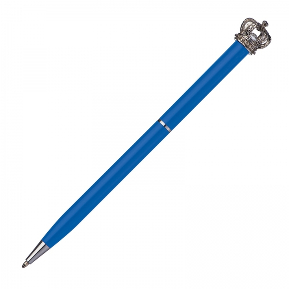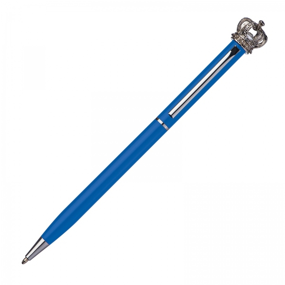 Metalowy długopis z mechanizmem obrotowym, zakończony koroną i kryształkiem Swarovskiego. Wkład pisze na niebiesko.