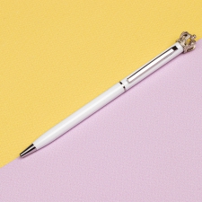 Metalowy długopis z koroną to eleganckie i luksusowe akcesorium, które łączy funkcjonalność z wyjątkowym designem. Wyposażony w mechanizm obrotowy oraz wkład piszący na niebiesko, zapewnia płynne i komfortowe pisanie. Zakończony koroną i kryształkiem Swarovskiego, dodaje długopisowi szlachetnego charakteru, który z pewnością przyciąga wzrok.Idealny do biura, na prezent lub jako wyjątkowy dodatek do codziennego użytku, ten długopis łączy elegancję z niezawodnością, czyniąc każdą notatkę wyjątkową.