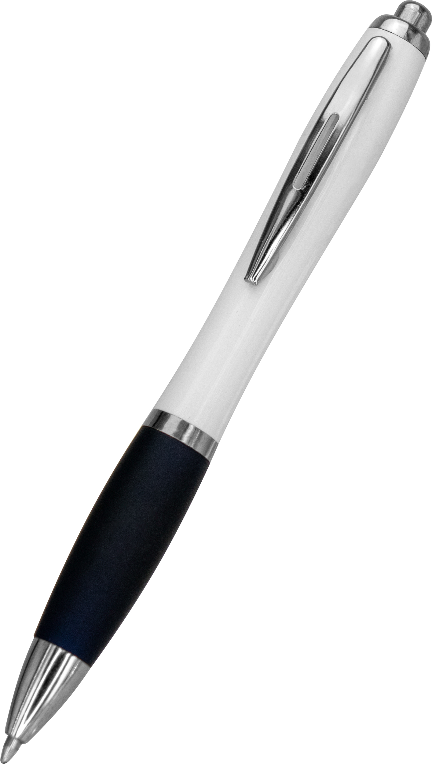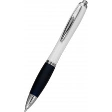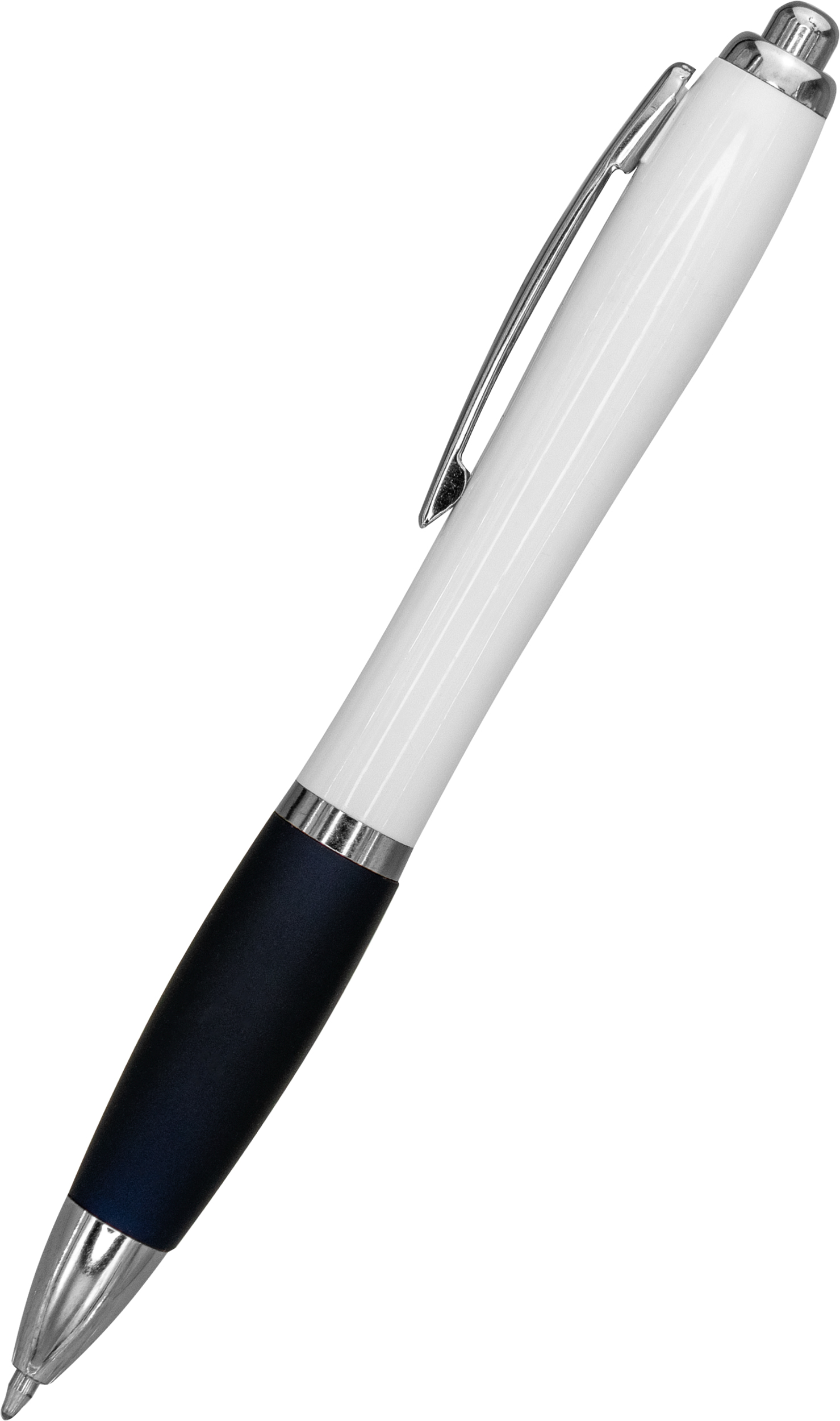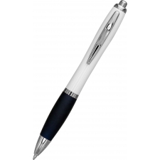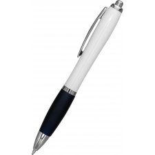 Długopis plastikowy z białym korpusem i kolorową gumką ułatwiającą trzymanie. Wyposażony w metalowy klips i duży wkład piszący na niebiesko.