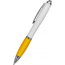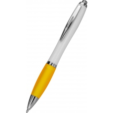 Długopis plastikowy z białym korpusem i kolorową gumką ułatwiającą trzymanie. Wyposażony w metalowy klips i duży wkład piszący na niebiesko.