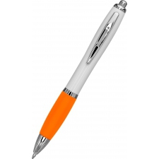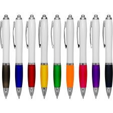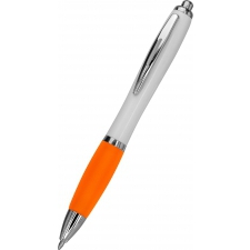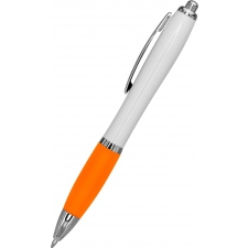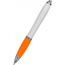Długopis plastikowy z białym korpusem i kolorową gumką ułatwiającą trzymanie. Wyposażony w metalowy klips i duży wkład piszący na niebiesko.