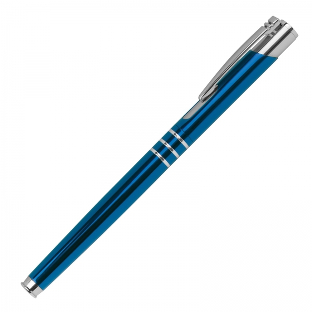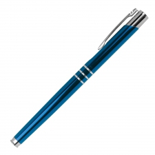 Zestaw z metalu i aluminium, składający się z piszącego na niebiesko długopisu i pióra kulkowego.