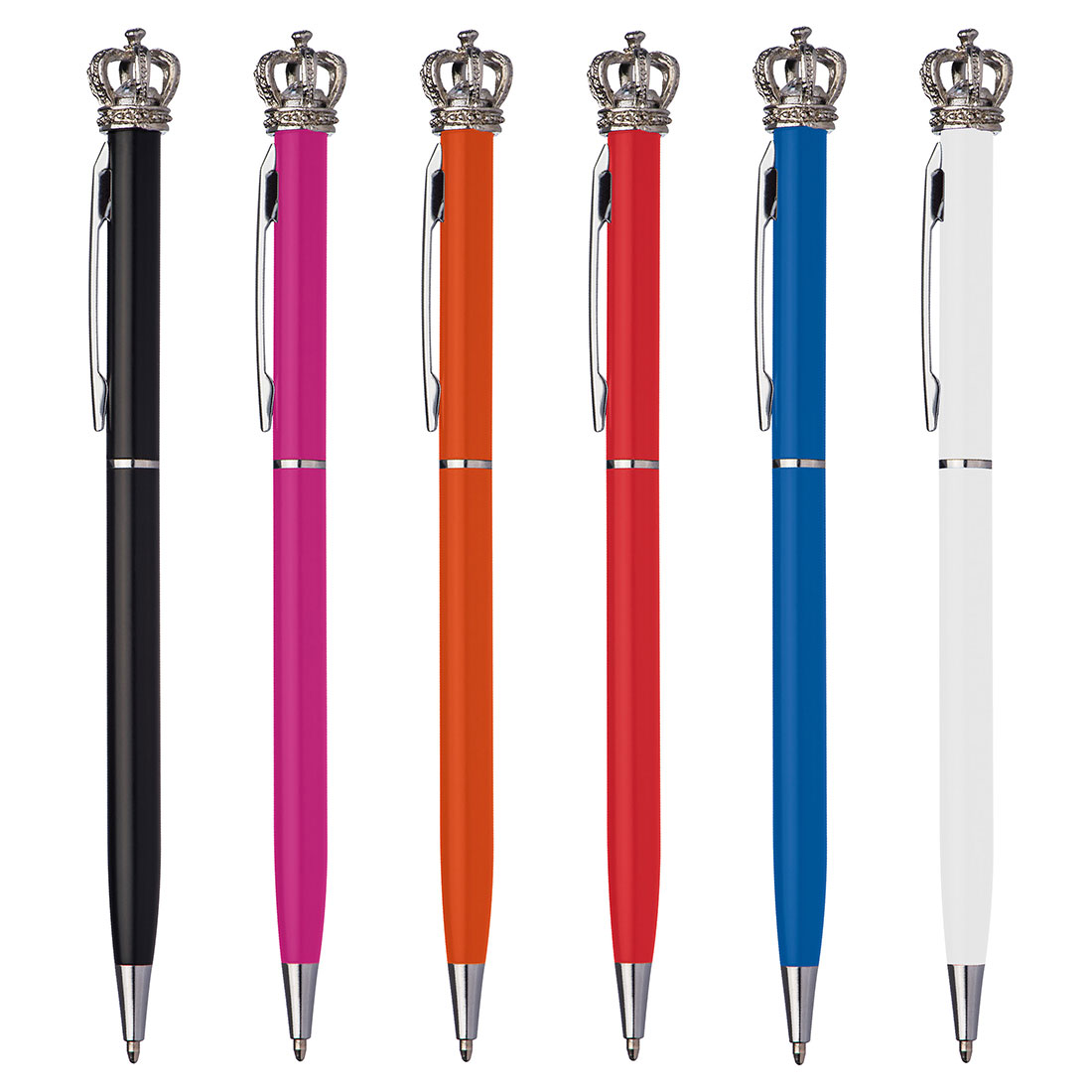Metalowy długopis z koroną to eleganckie i luksusowe akcesorium, które łączy funkcjonalność z wyjątkowym designem. Wyposażony w mechanizm obrotowy oraz wkład piszący na niebiesko, zapewnia płynne i komfortowe pisanie. Zakończony koroną i kryształkiem Swarovskiego, dodaje długopisowi szlachetnego charakteru, który z pewnością przyciąga wzrok.Idealny do biura, na prezent lub jako wyjątkowy dodatek do codziennego użytku, ten długopis łączy elegancję z niezawodnością, czyniąc każdą notatkę wyjątkową.