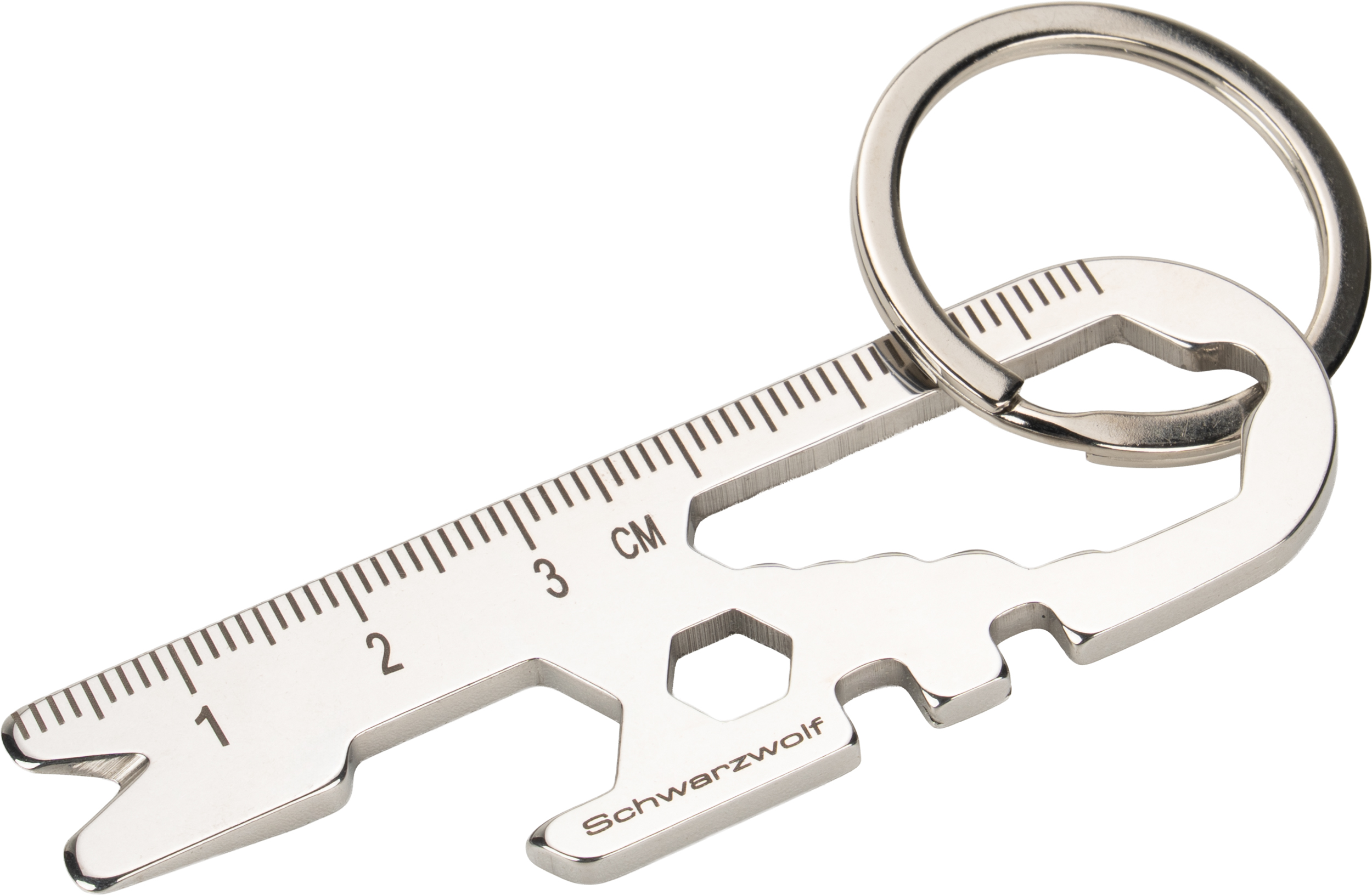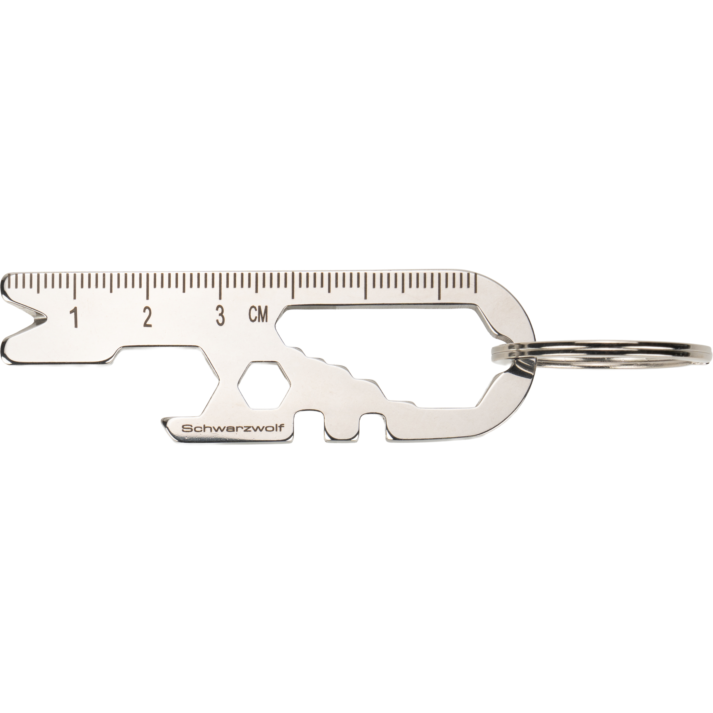 Wielofunkcyjny brelok marki Schwarzwolf zawierający 13 różnych narzędzi, w tym linijkę, magnes, klucz w 6 rozmiarach oraz otwieracz do butelek.