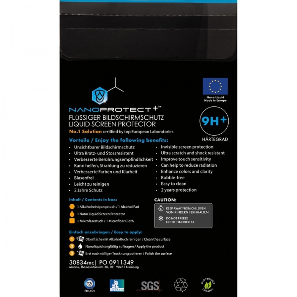 Płynne szkło ochronne na smartfony, smartwatche i tablety. Idealnie przylegające płynne szkło zapewnia dużo lepszą ochronę wyświetlacza niż tradycyjna folia i jest całkowicie niewidoczne. Logotyp można umieścić na opakowaniu.