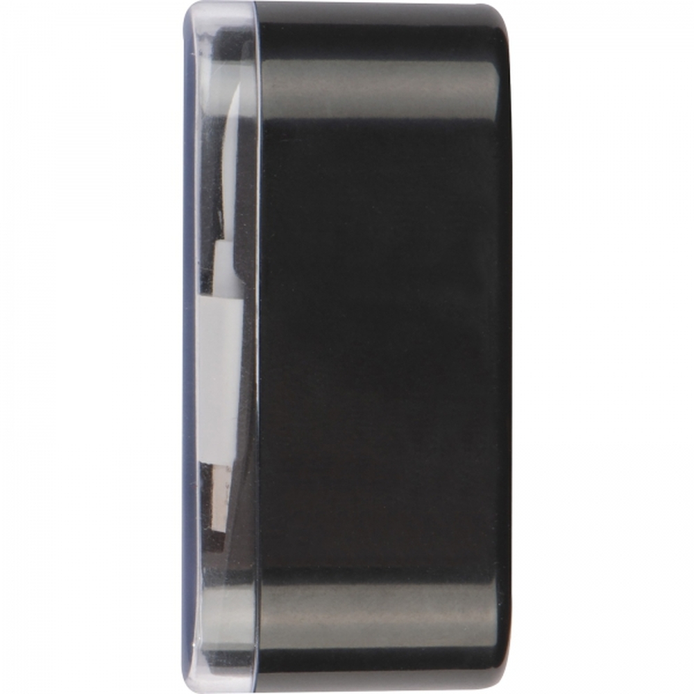 Zestaw przejściówek do ładowania urządzeń z systemem Android i iOS, portami micro USB oraz USB. Całość zapakowana w plastikowe pudełko z przezroczystym wieczkiem.