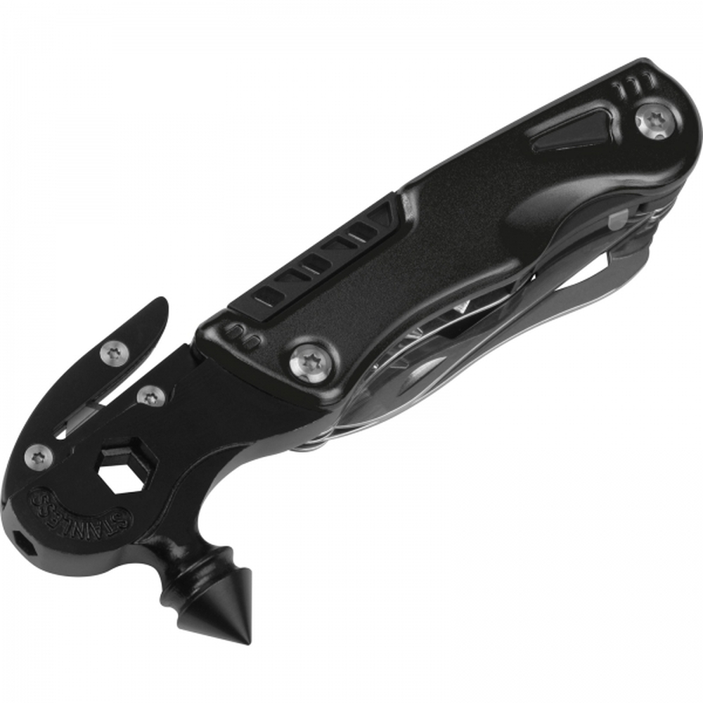 Multinarzędzie wykonane z metalu, posiada lampkę LED, młotek awaryjny, śrubokręt, klucz, otwieracz, nóż i przecinak do pasów bezpieczeństwa. Narzędzie zapakowane w pokrowiec. Produkt zawiera baterie.
