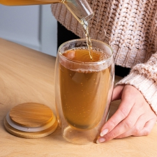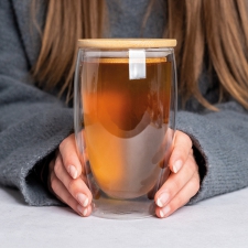 Szklanka z podwójnymi ściankami, wykonana ze szkła, o pojemności 500 ml, z bambusowym wieczkiem.
