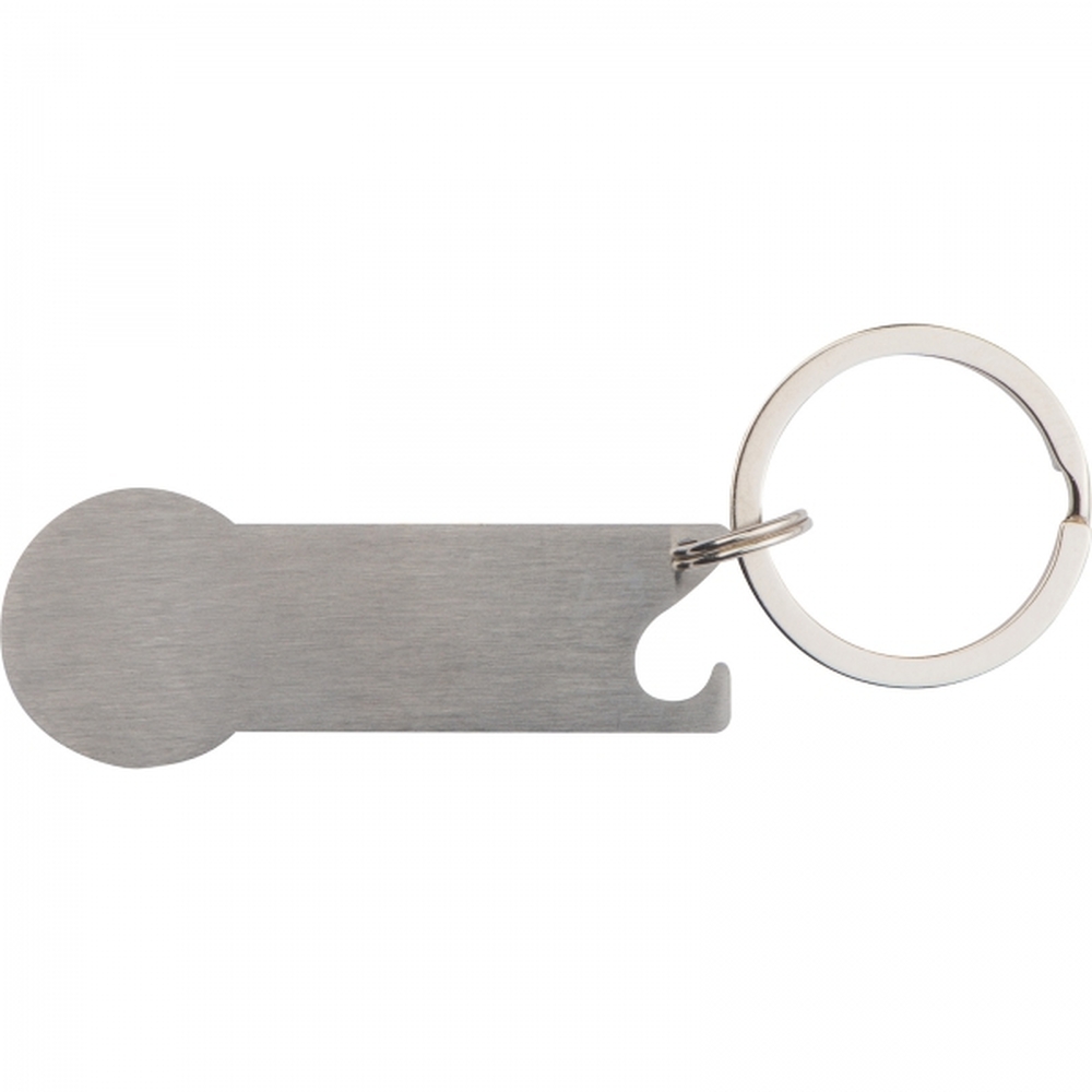 Metalowy brelok do kluczy z żetonem do wózka sklepowego i otwieraczem.