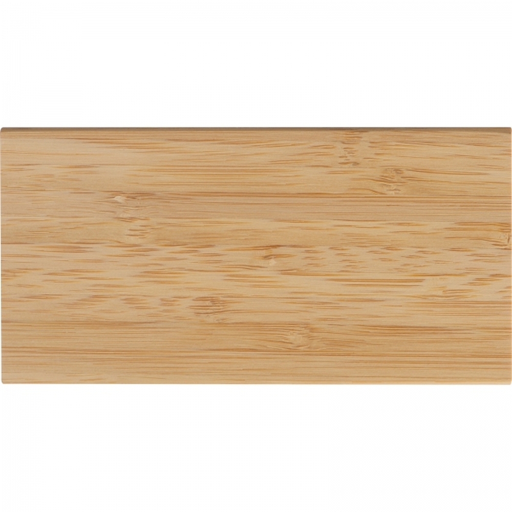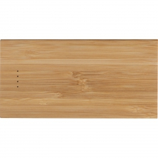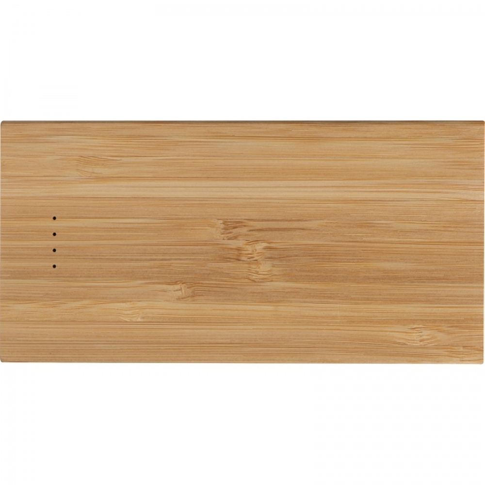 Power bank w bambusowej obudowie, o mocy 8 000 mAh, kabel USB w zestawie.