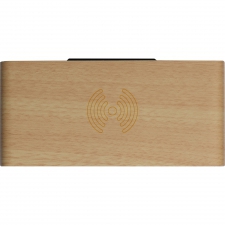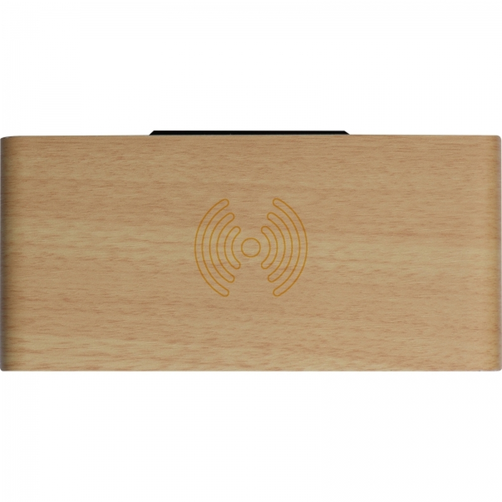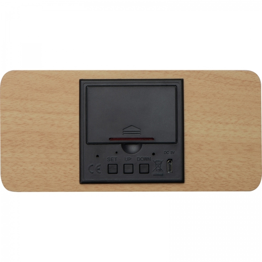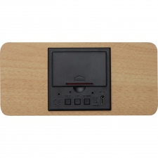 Zegar na biurko wykonany z drewna i plastiku, z termometrem i bezprzewodową ładowarką.