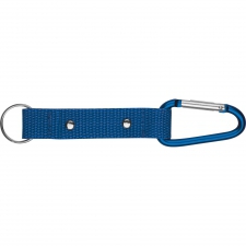 Metalowy brelok do kluczy z karabińczykiem na poliestrowej taśmie.