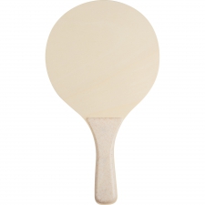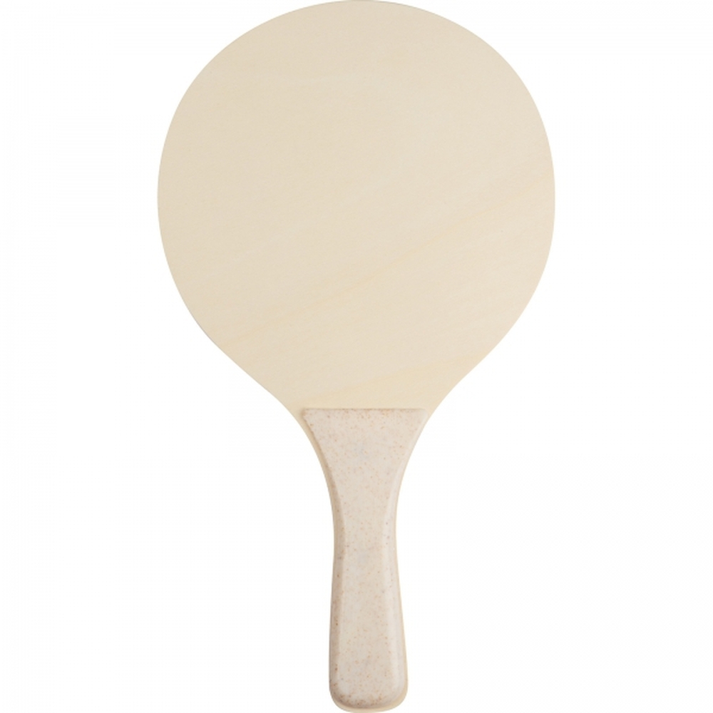 Zestaw plażowy do gry, zawiera dwie paletki wykonane z drewna z plastikowym uchwytem oraz piłeczkę. Paletki zapakowane w siatkę.