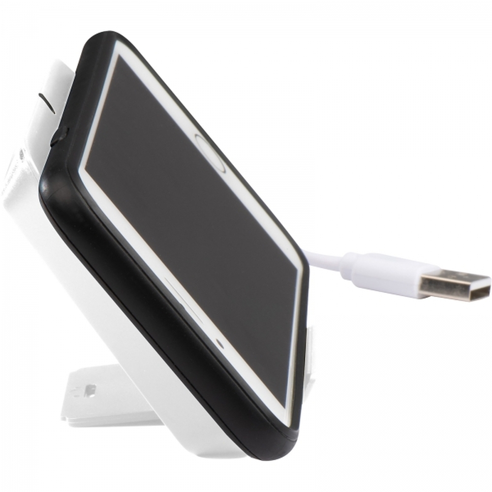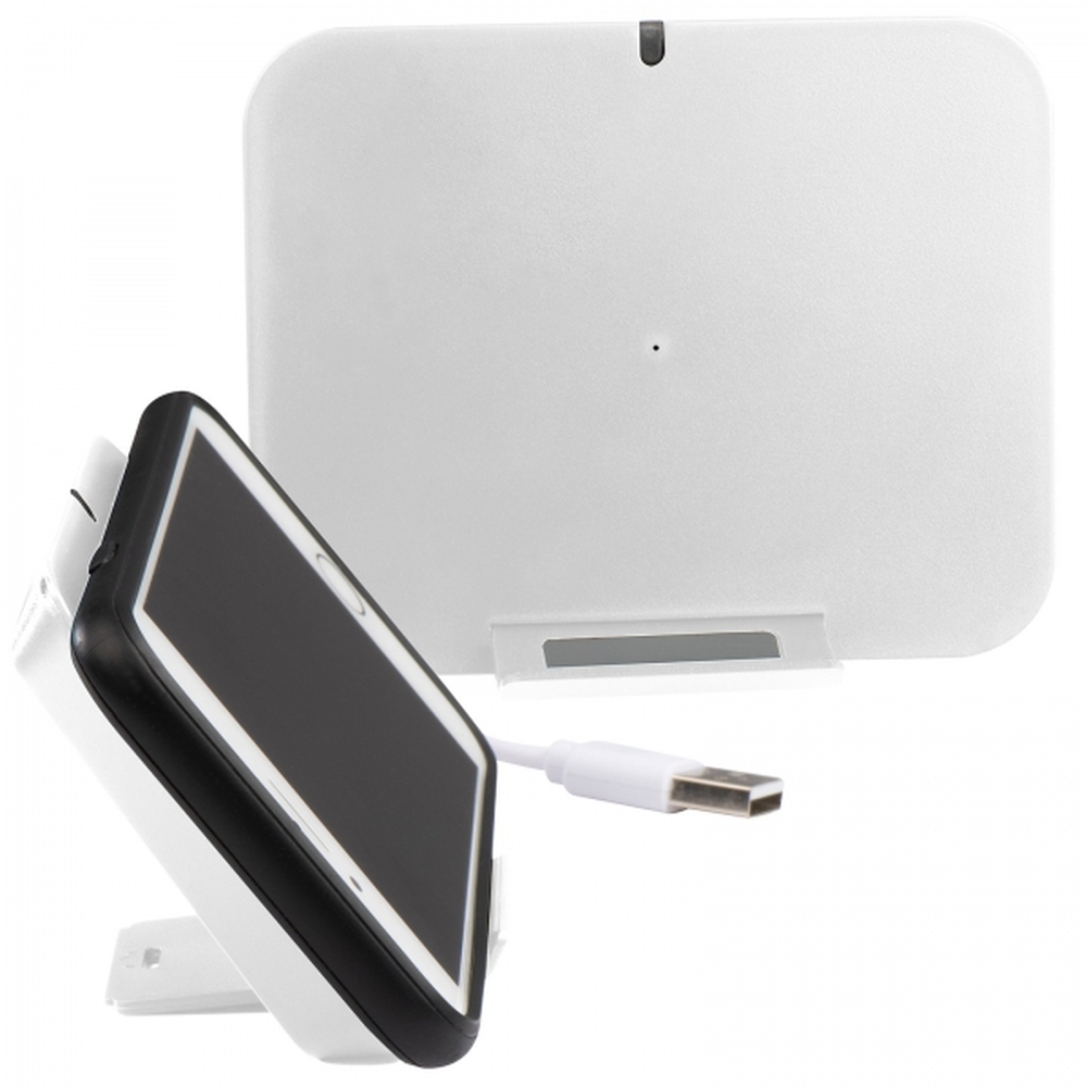 Ładowarka indukcyjna (QI standard) z plastiku. Może służyć także jako stojak na telefon. Kabel micro USB w zestawie. Moc wejściowa: 5V/2A, moc wyjściowa 5V/1A.