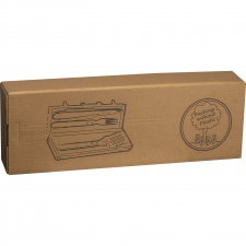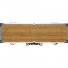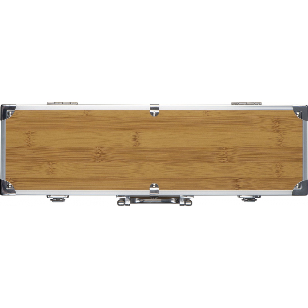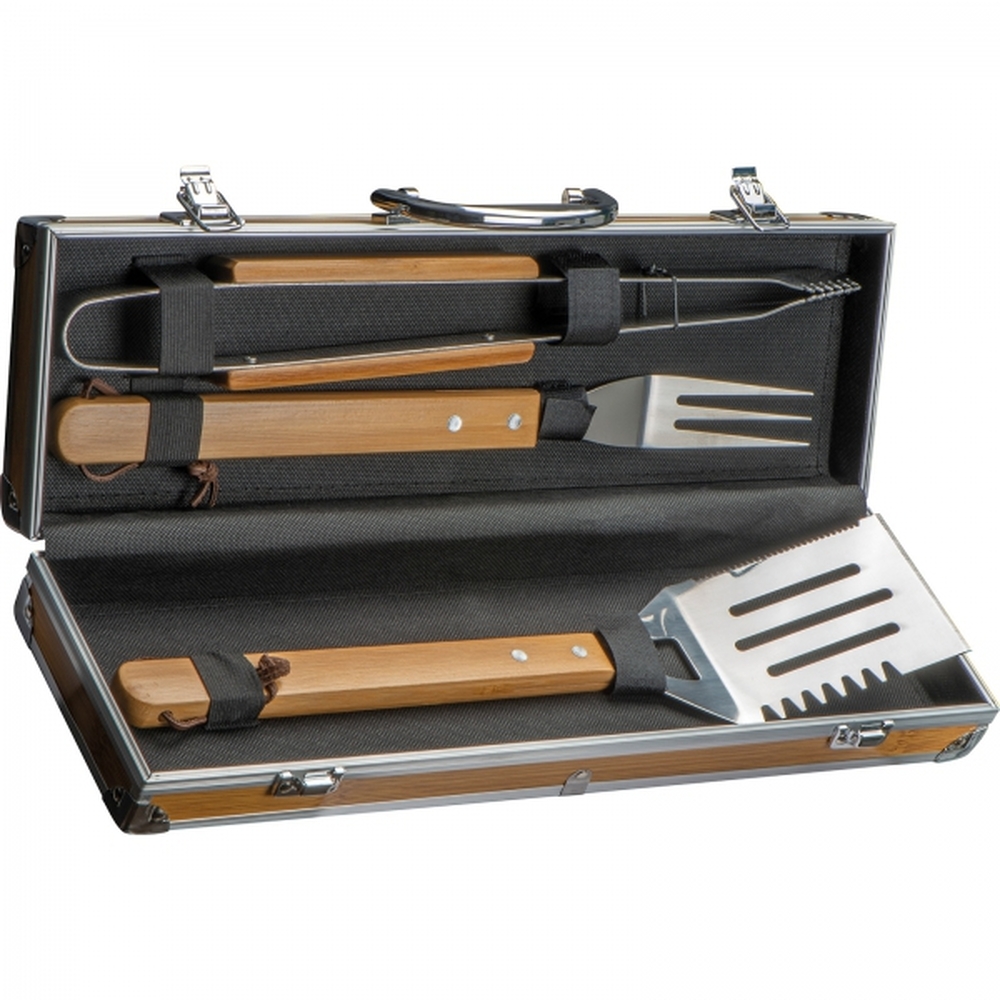 3-częściowy zestaw do grilla w porzęcznej walizce ze wstawkami z bambusa. Wewnątrz znajdują się szczypce, widelec do mięsa i szpatułka.