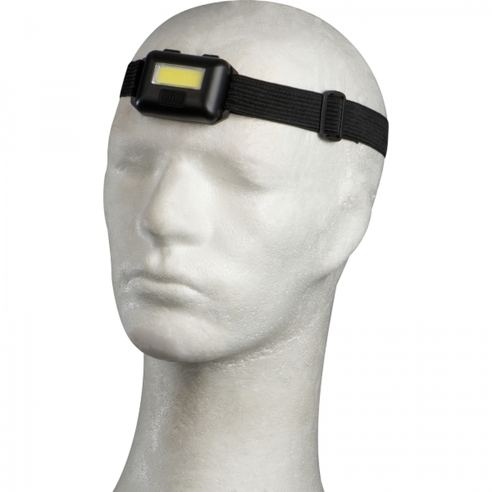 Plastikowa latarka COB na głowę z regulowanym, gumowym paskiem. Moc 3W. Wyposażona w 3 tryby świecenia (światło stałe, migające i przyciemniane). Dzięki stabilnej podstawie latarkę można też zdjąć z czoła i używać jak zwykłą lampkę.
