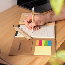 W środku znajduje się 80-stronicowy notes w linie, a także 20 kolorowych samoprzylepnych karteczek w 5 różnych kolorach, które ułatwiają oznaczanie i organizowanie ważnych informacji. Zestaw zawiera również dwie linijki (w tym jedną drewnianą), długopis, drewnianą temperówkę, gumkę do ścierania oraz dwa ołówki.To idealne rozwiązanie zarówno do biura, jak i na prezent dla osób ceniących porządek i wygodę w codziennej pracy.