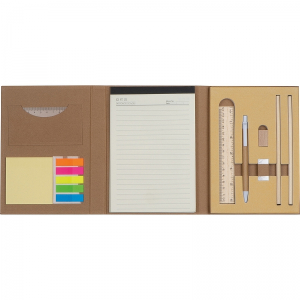 Podwójnie składany, zamykany na gumkę tekturowy folder zawiera: 80-stronicowy notes w linie, 20 kolorowych samoprzylepnych karteczek w 5 kolorach, żółte karteczki, dwie linijki (w tym jedna drewniana), długopis, drewnianą temperówkę, gumkę do ścierania i dwa ołówki.