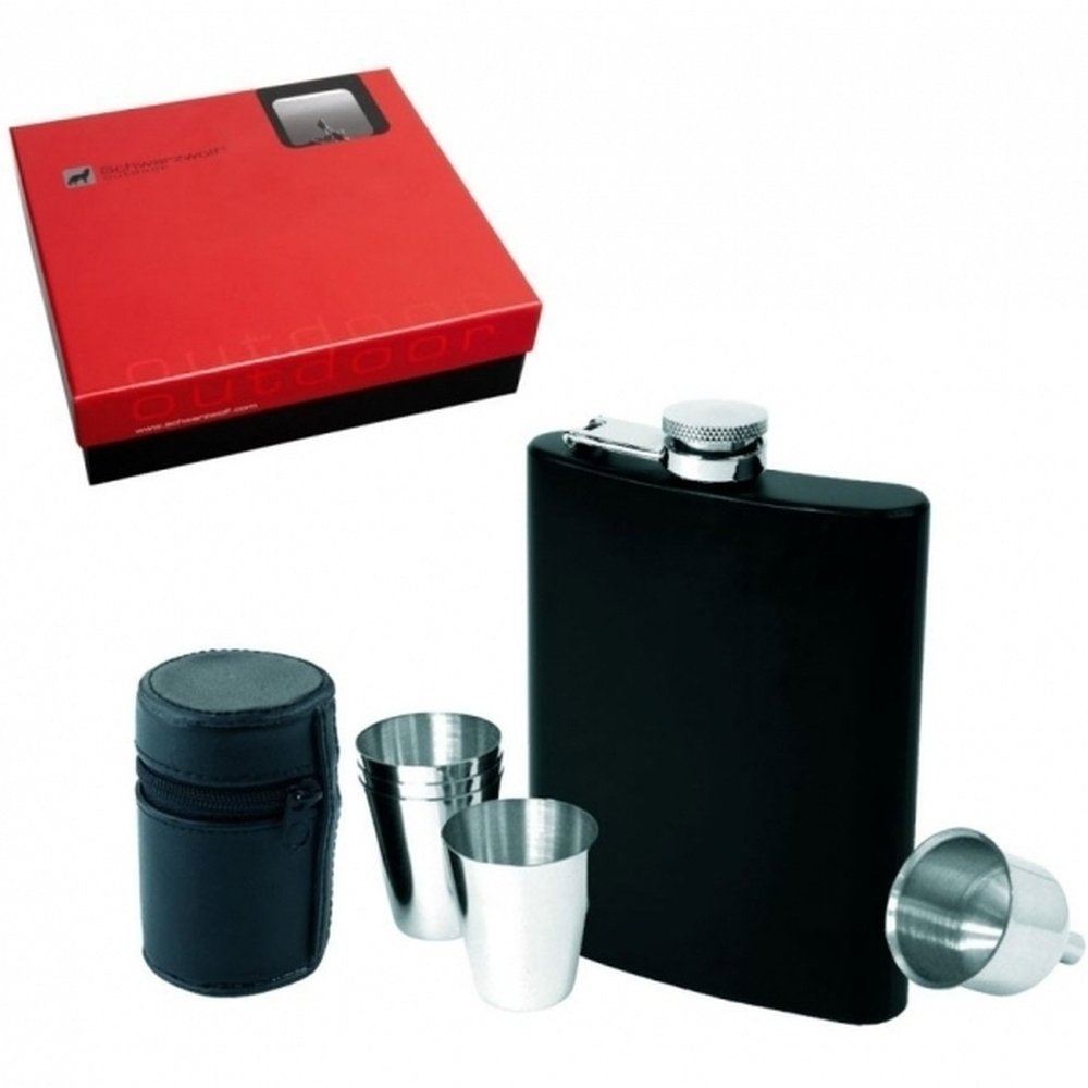 Piersiówka o pojemności 237 ml marki Schwarzwolf. Piersiówka o prostym kształcie, z czterema kieliszkami w zestawie.