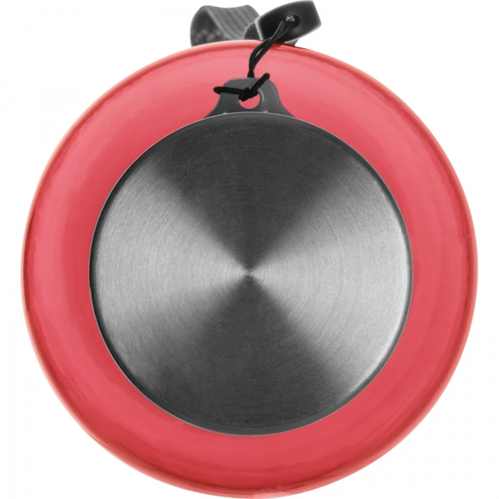 Butelka z wytrzymałego materiału PET, posiada metalową nakrętkę z przymocowanym do niej sznureczkiem.