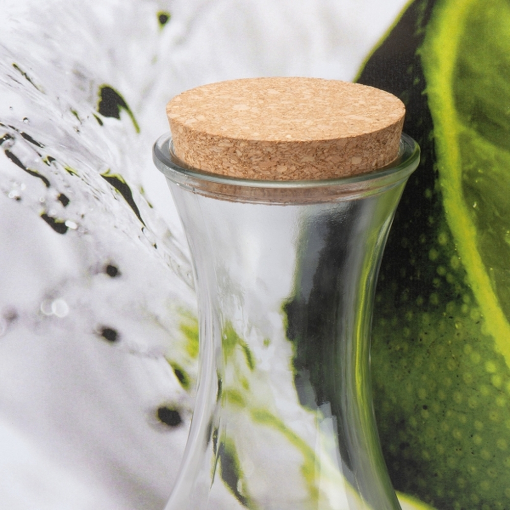 Szklana karafka o pojemności 1 litra z korkową zatyczką.