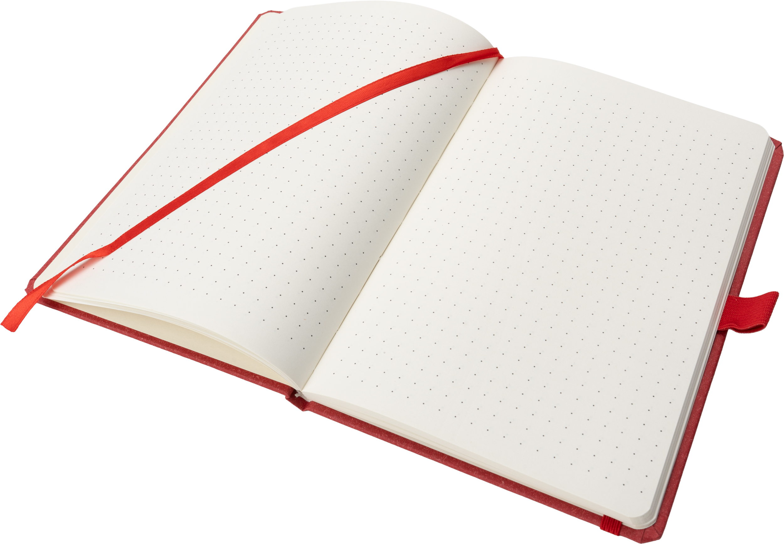 Notes o formacie A5 z zakładką i 160 stronami w kropki, zamykany na gumkę. Zarówno tekturowa okładka, jak i kartki są wykonane z papieru pochodzącego z recyklingu.