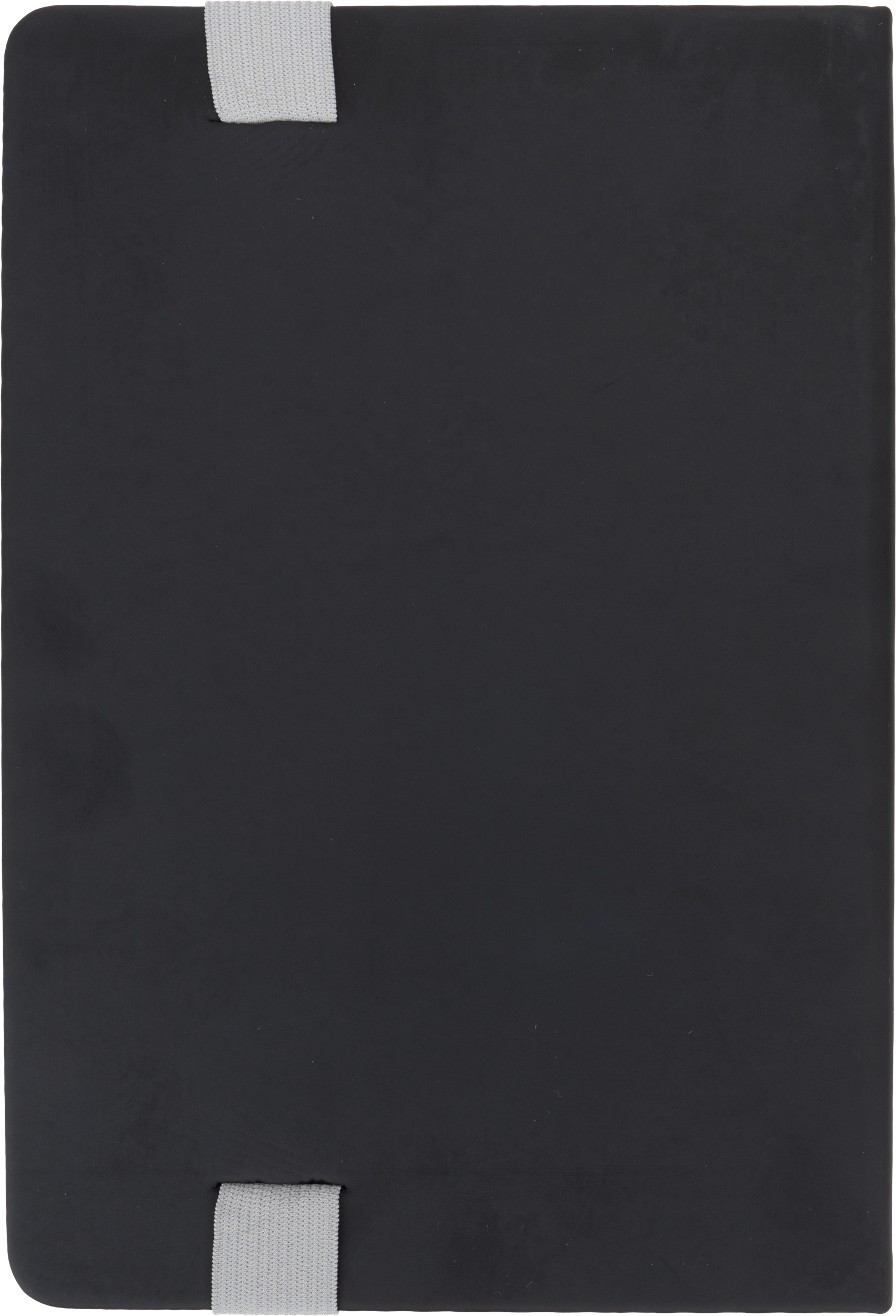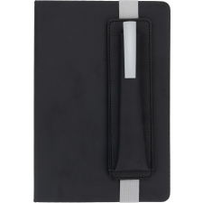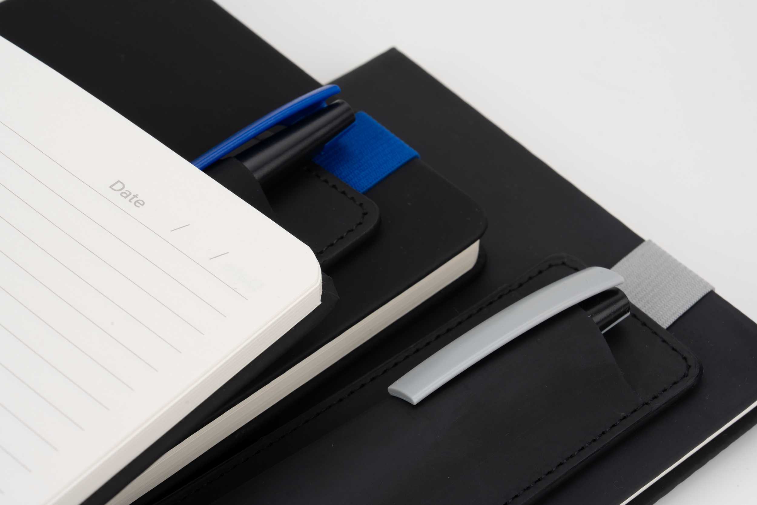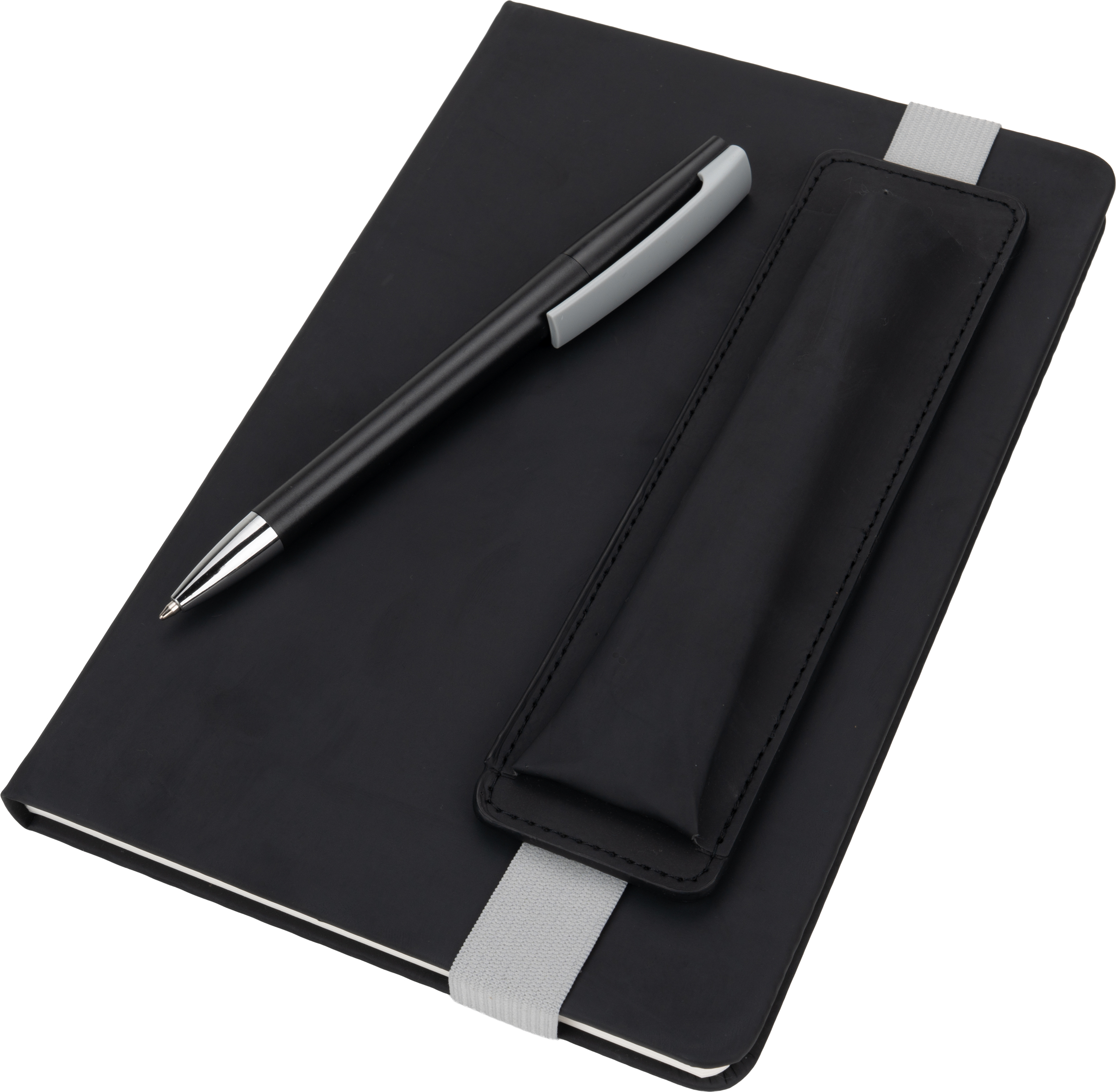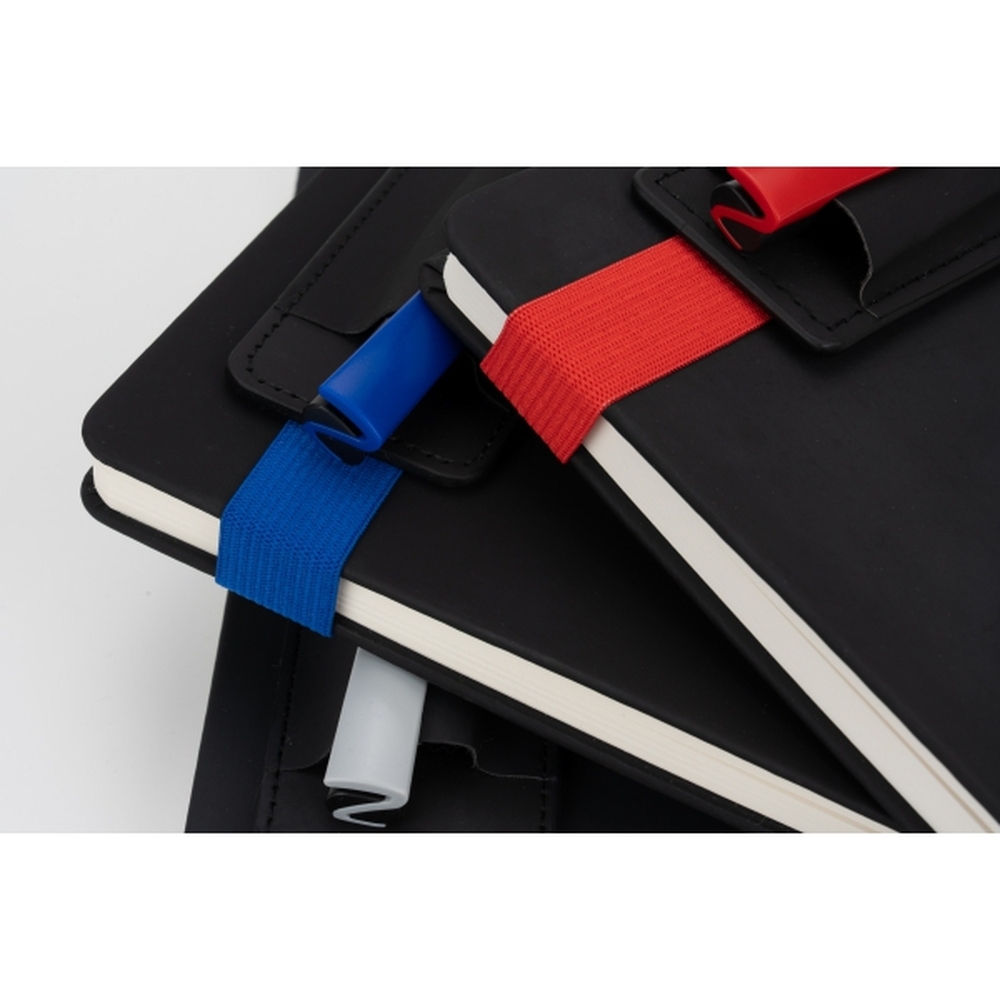 A5 notebook with a PU cover and 192 lined pages, a bookmark and an elastic band to close the notebook, with a pen holder included with the notebook - a pen made of ABS, writing in blue.