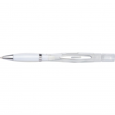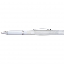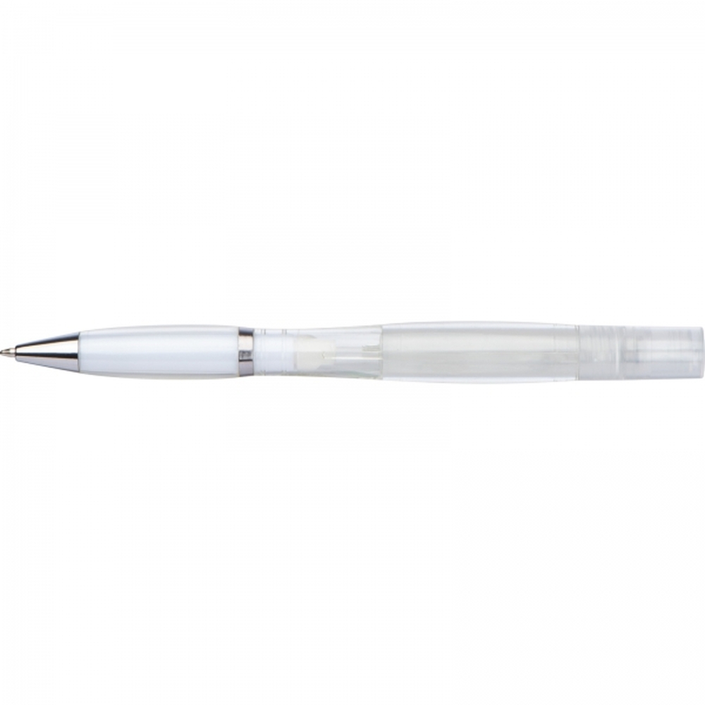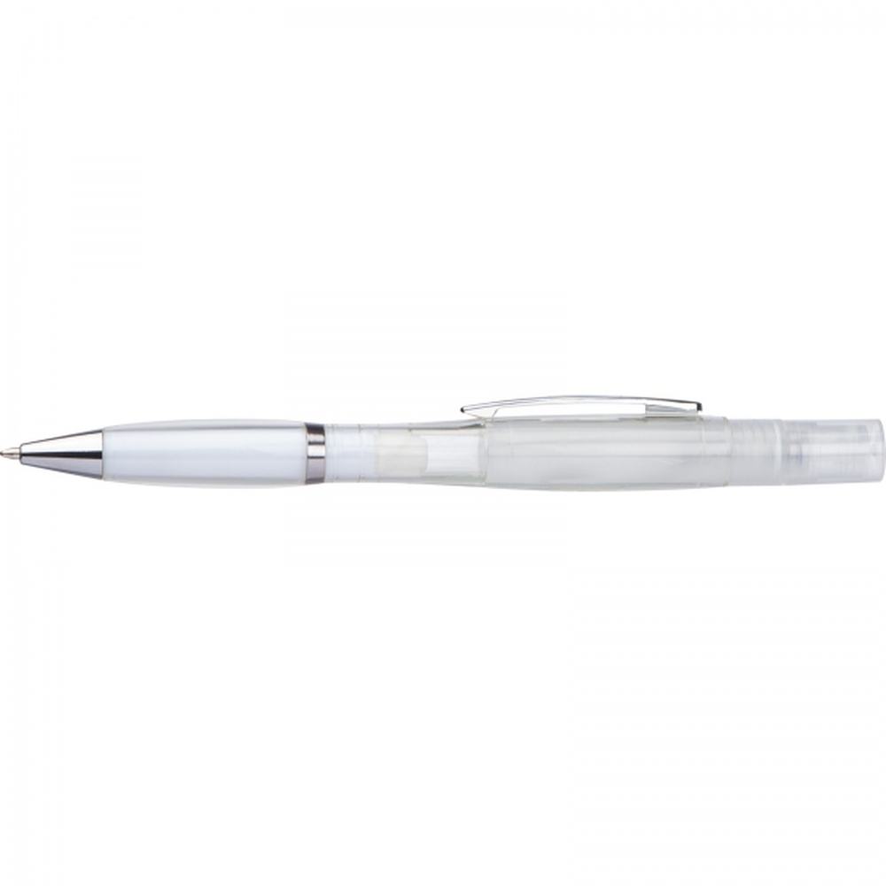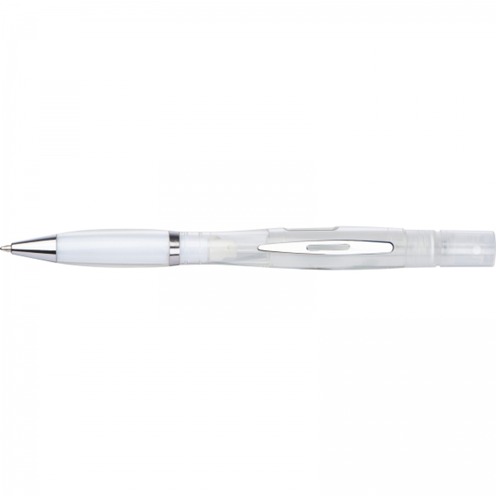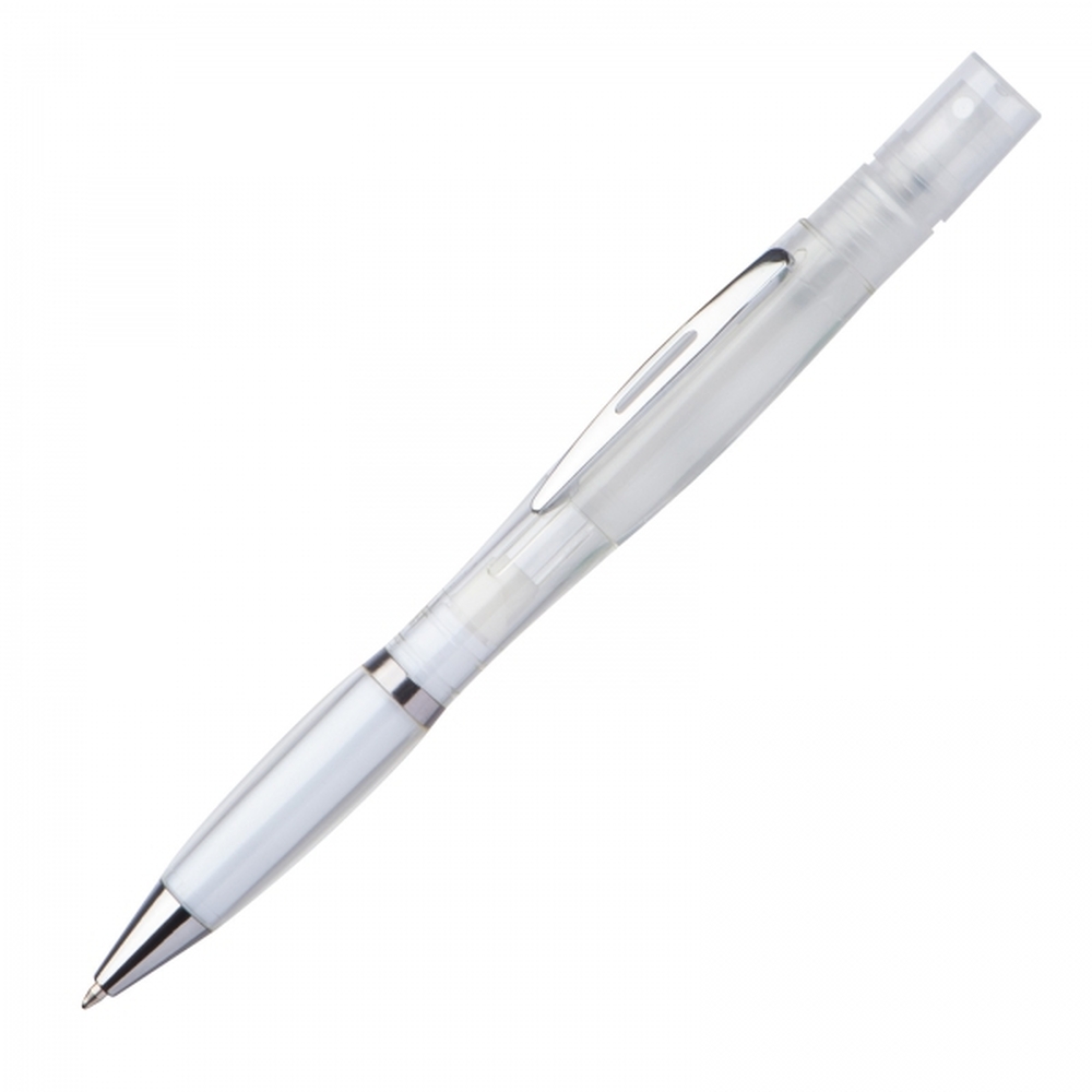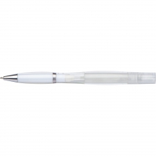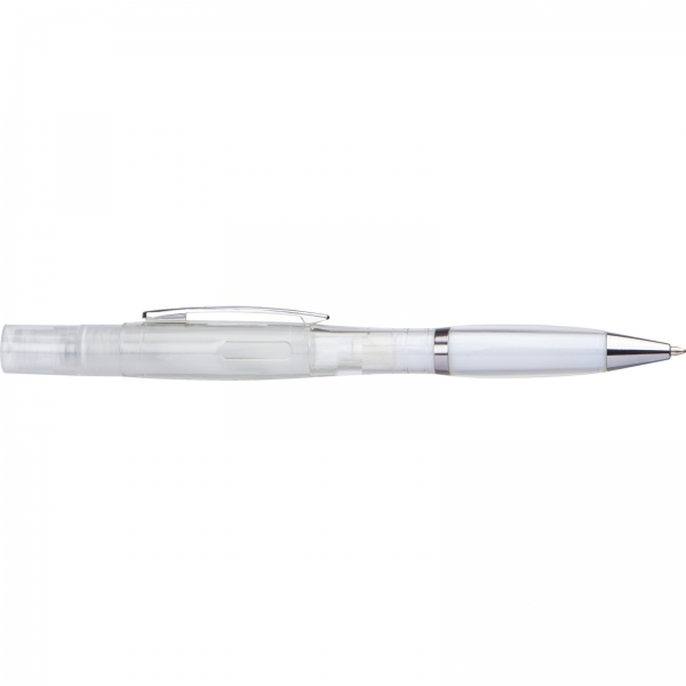 Plastikowy długopis z przekręcanym mechanizmem i wkładem piszącym na niebiesko, posiada atomizer do płynu dezynfekującego lub perfum.