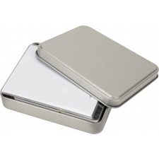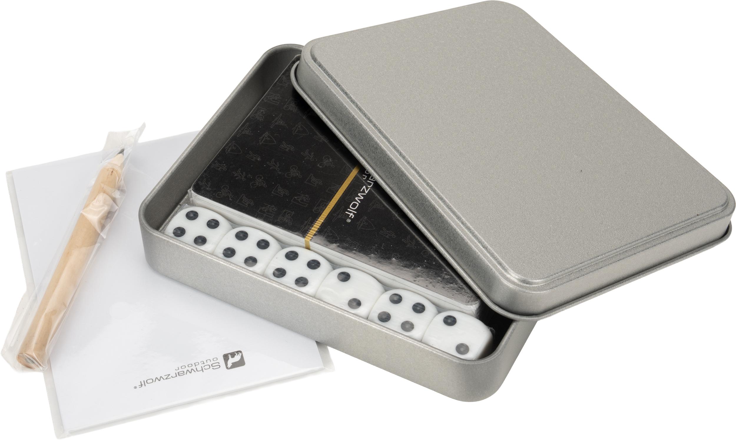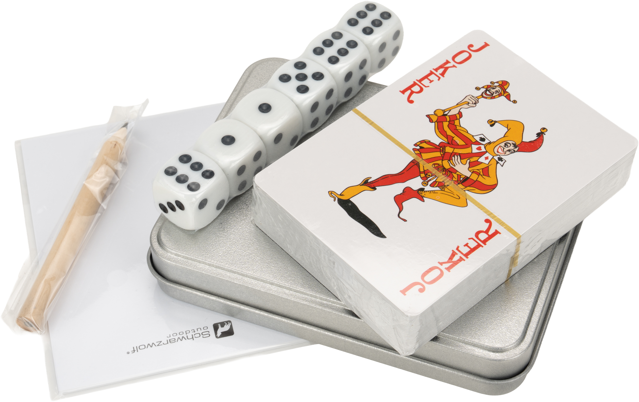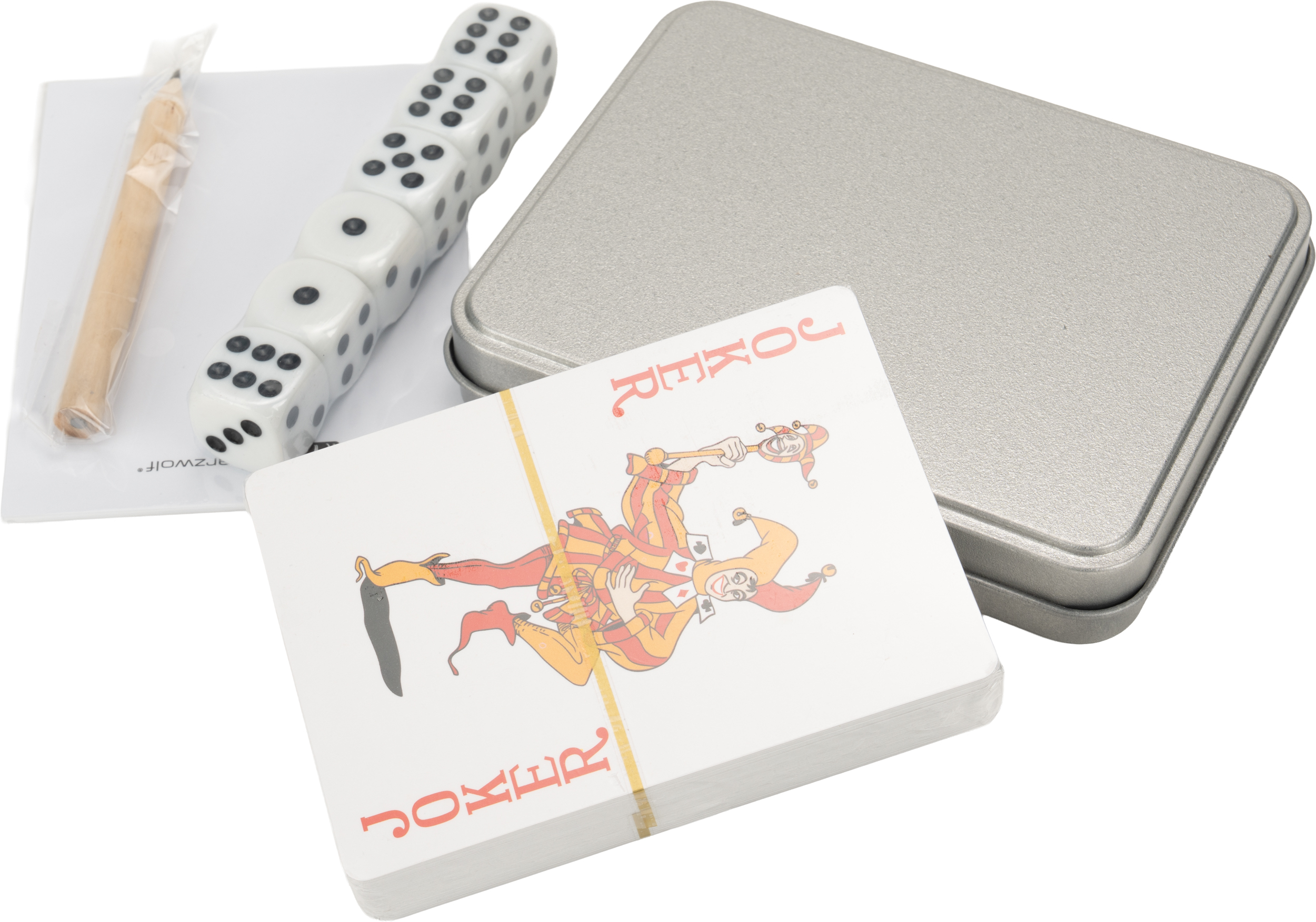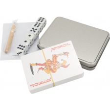 Podróżny zestaw do gier, zapakowany w blaszane pudełko. Wewnątrz znajduje się talia 54 kart z wodoodporną powierzchnią, 6 kości do gry, 15 kartek oraz ołówek. Rozmiar pudełka - 8,5 x 11 x 2 cm, karty - 6,2 x 8,7 cm.