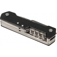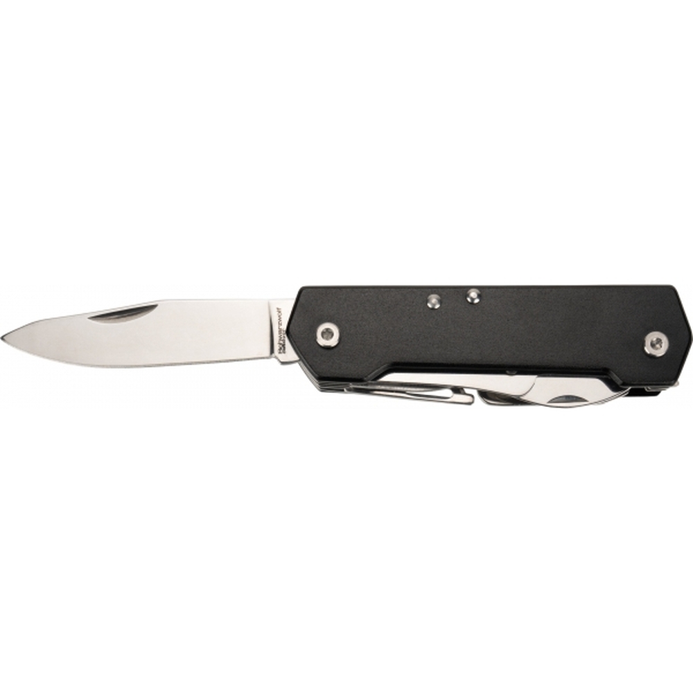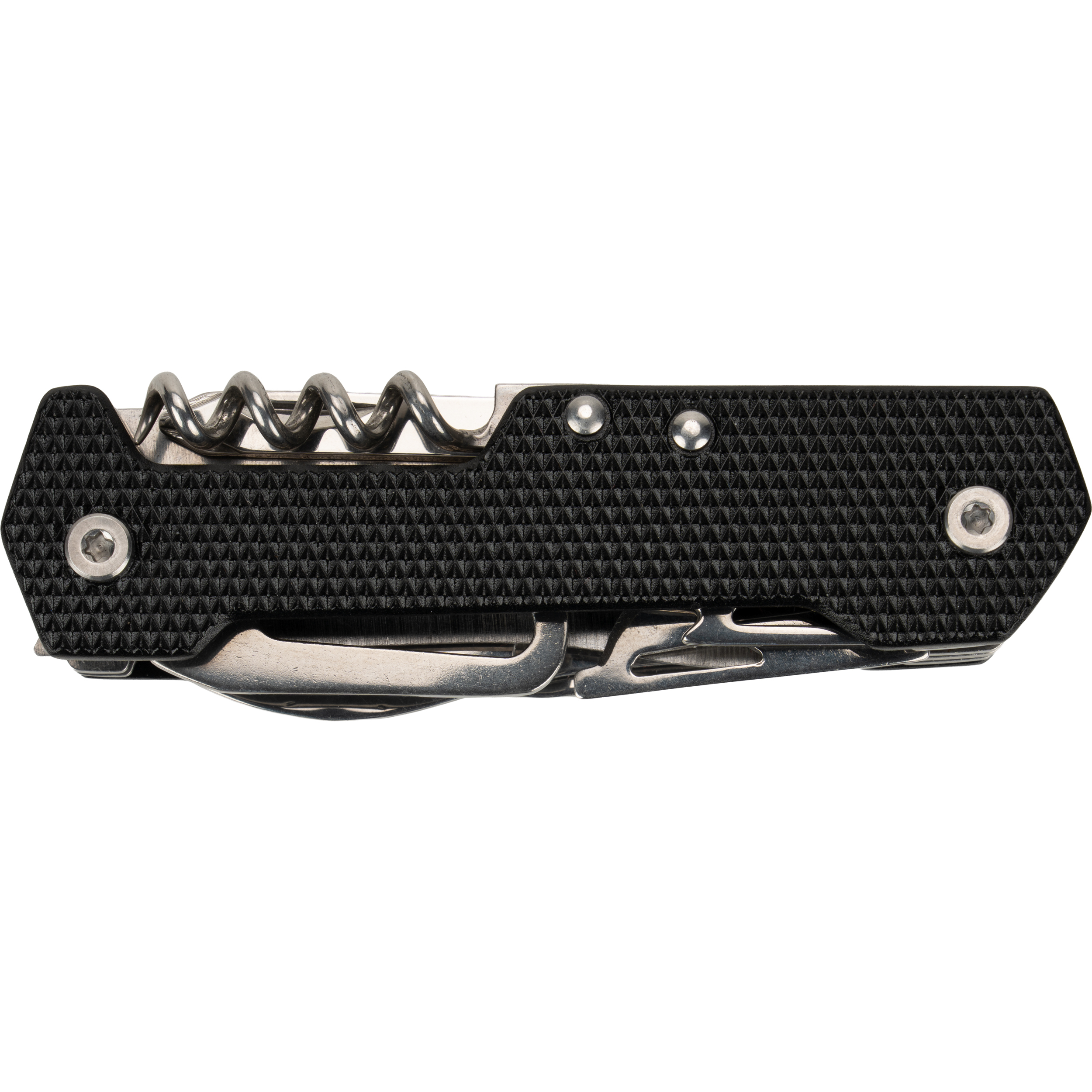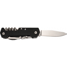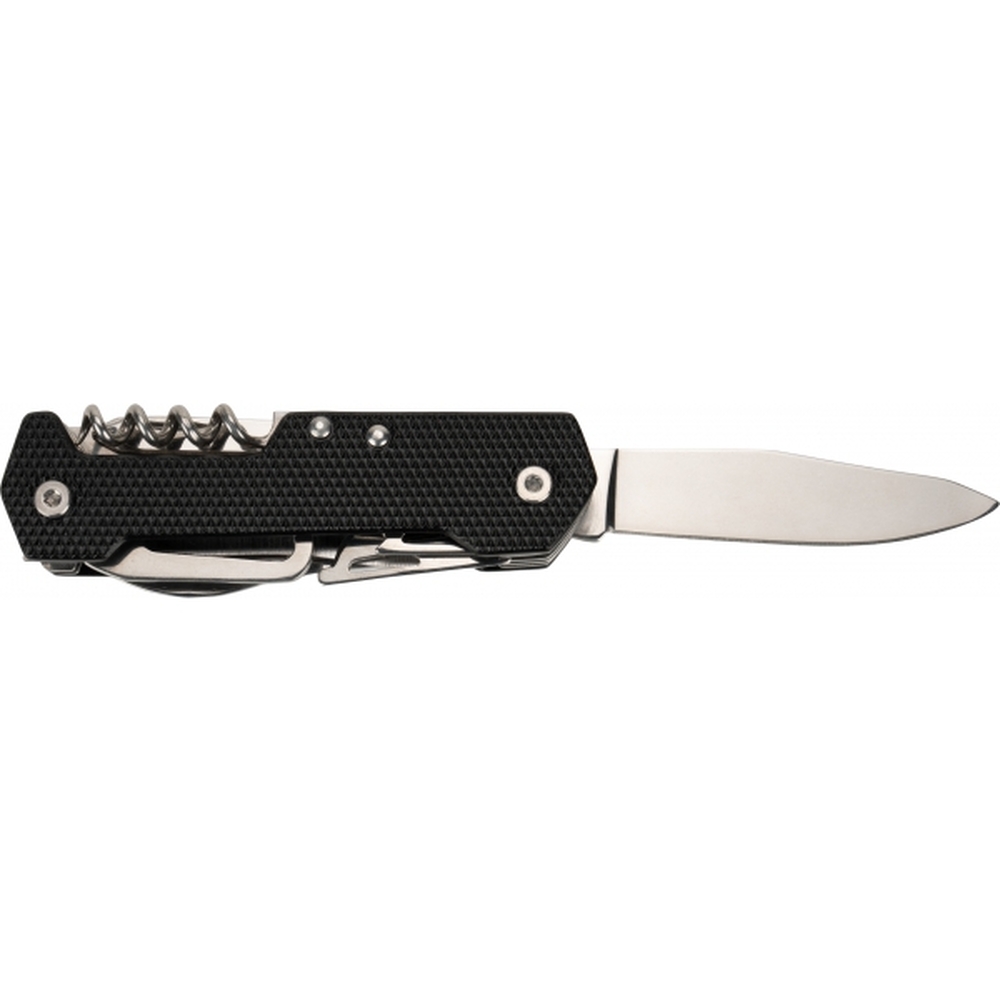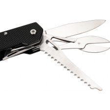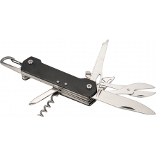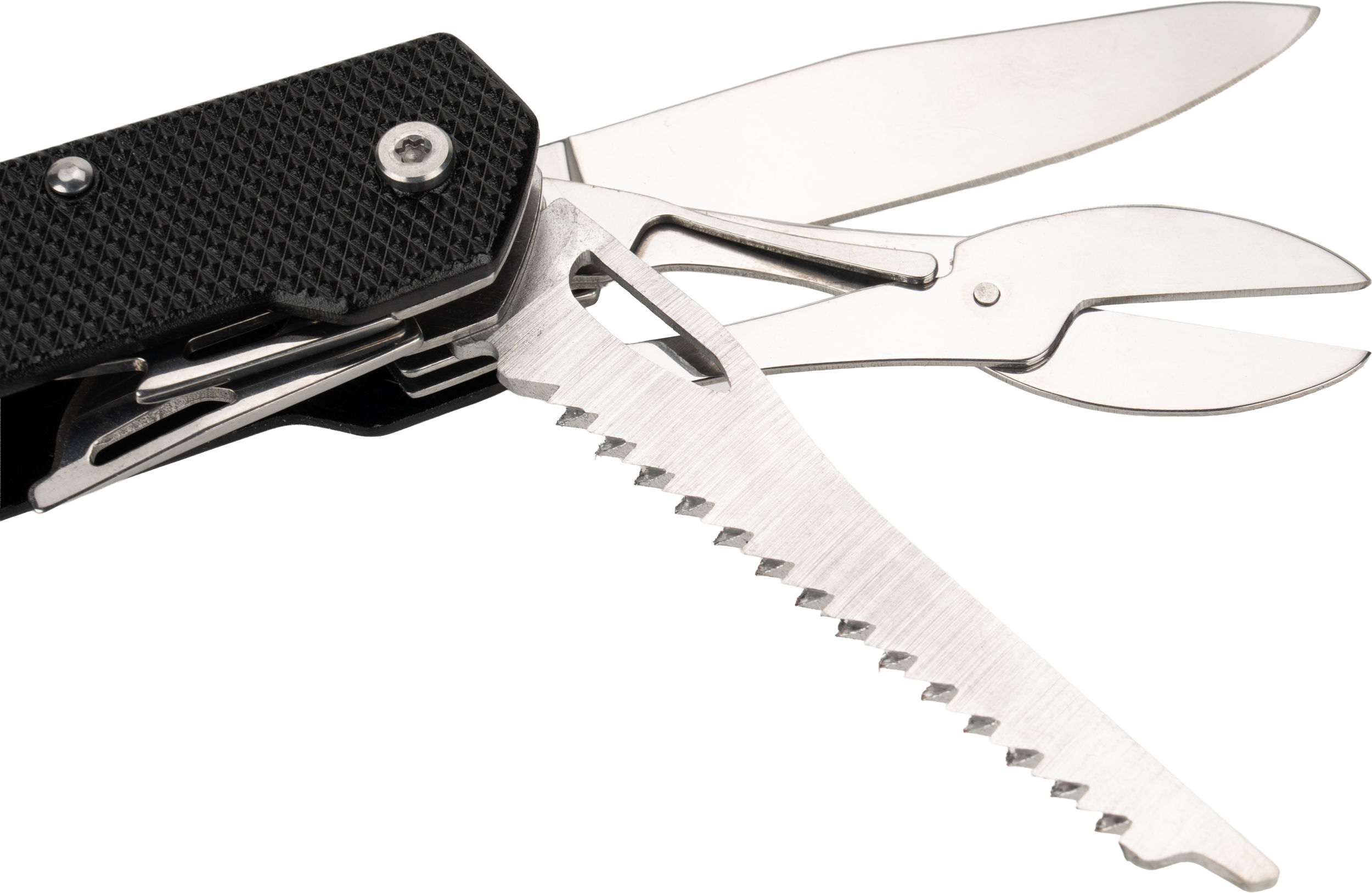 Wielofunkcyjny scyzoryk, posiadający 9 przydatnych narzędzi - nóż, nożyczki, piła, korkociąg, otwieracz do butelek, otwieracz do konserw, płaski śrubokręt, śrubokręt phillips i karabińczyk.
