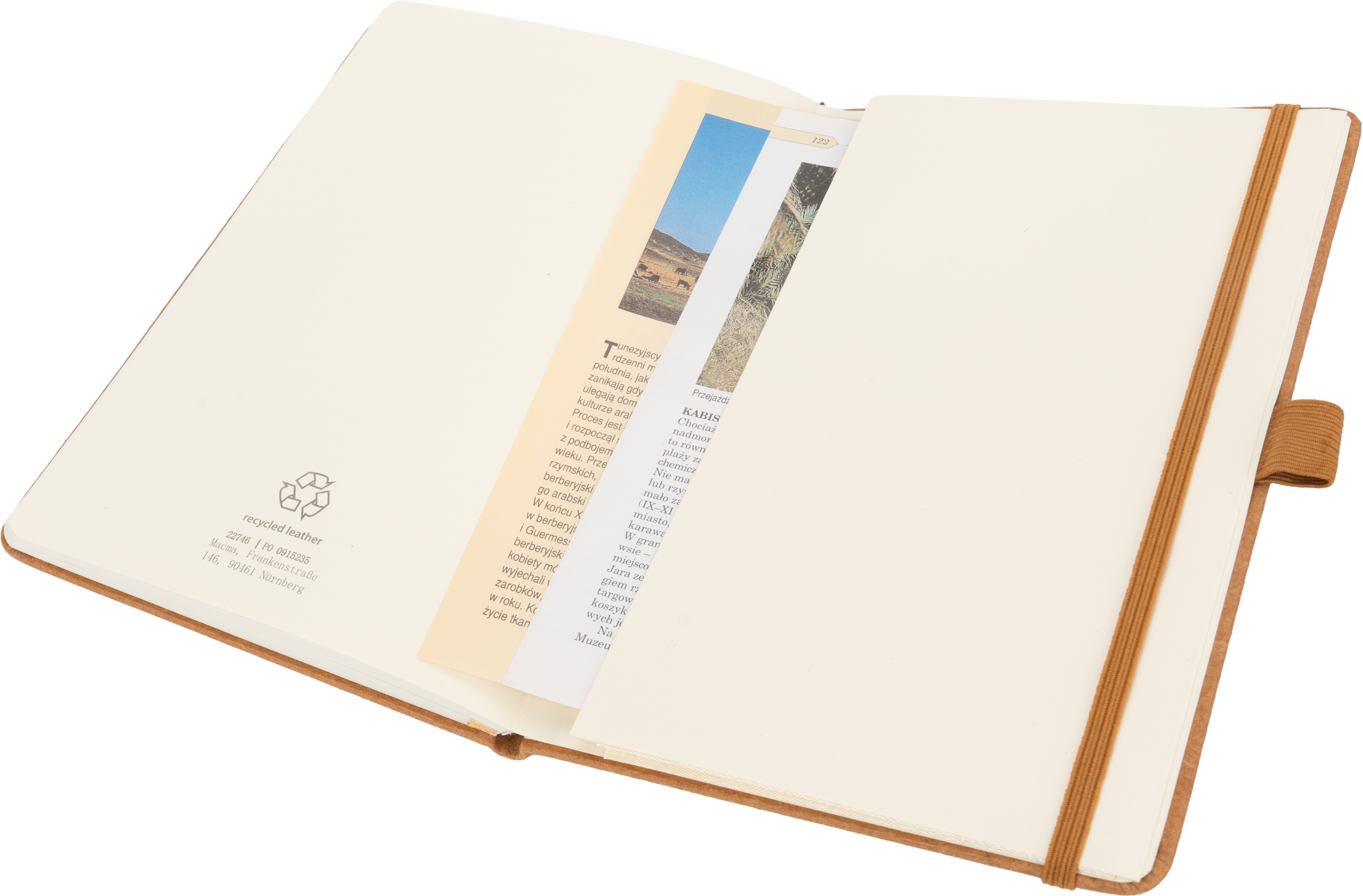 Notes o formacie A5, wykonany ze skóry pochodzącej z recyklingu z zamknięciem na gumkę. Wewnątrz znajduje się 160 kartek w linie.