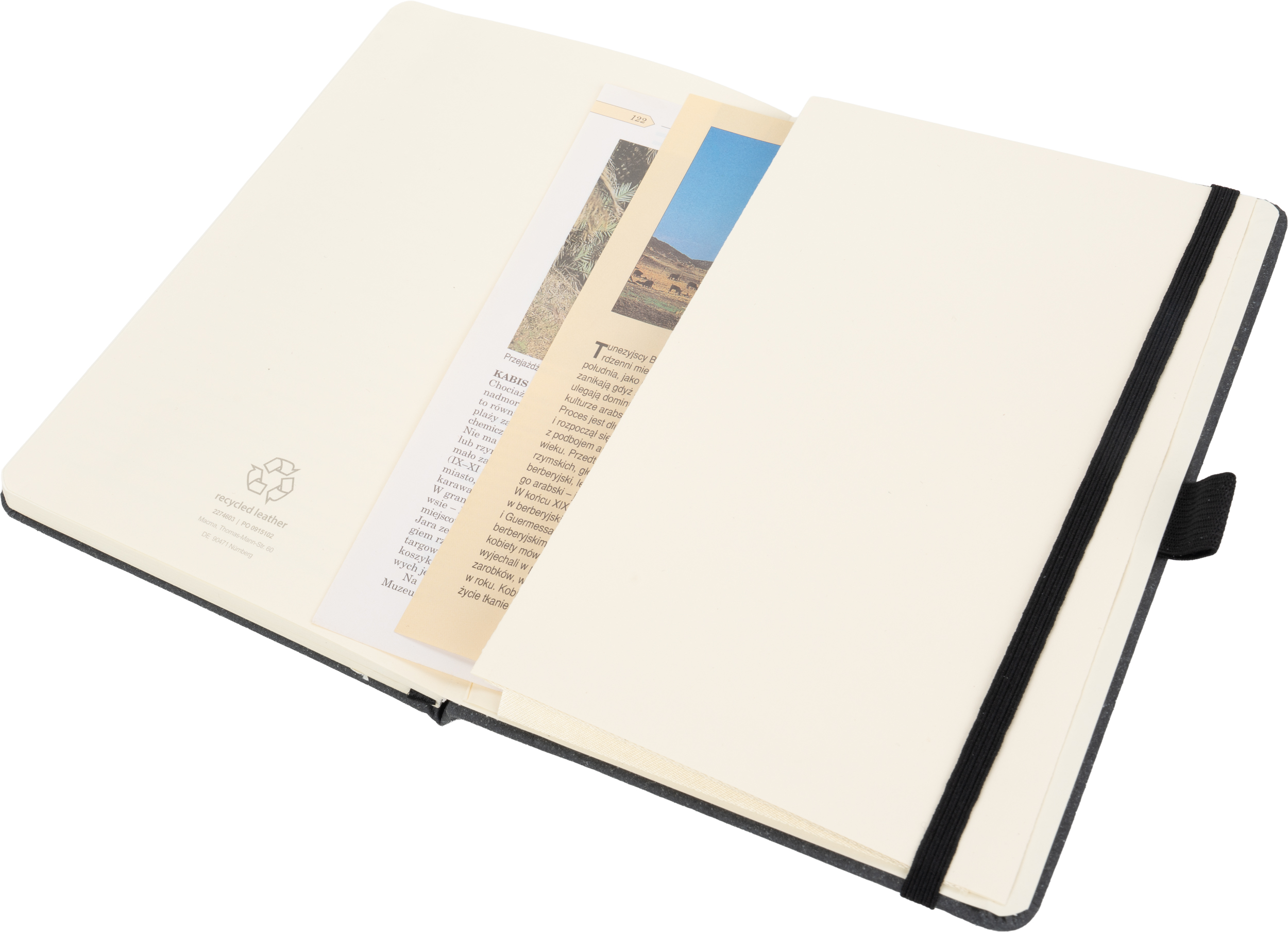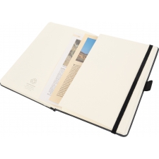 Notes o formacie A5, wykonany ze skóry pochodzącej z recyklingu z zamknięciem na gumkę. Wewnątrz znajduje się 160 kartek w linie.