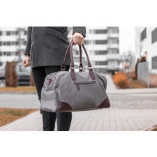 Stylowa i użyteczna torba podróżna marki Mark Twain, wykonana wytrzymałego płóciennego materiału z kontrastującymi wstawkami z ekoskóry. Posiada długi, odpinanay pasek do noszenia na ramieniu.