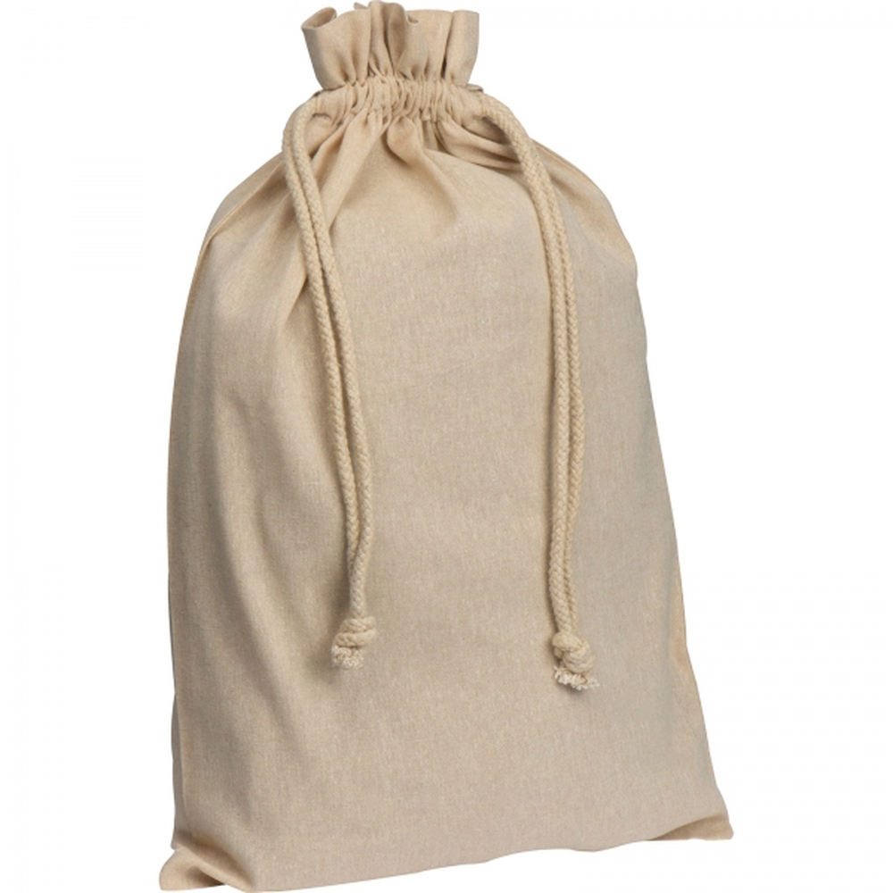 Duży woreczek bawełniany wykonany z bawełny pochodzącej z recyklingu, z certfikatem Oeko-Tex® STANDARD 100, gramatura 110g/m². Woreczek zamykany za pomocą sznureczków ściągających.