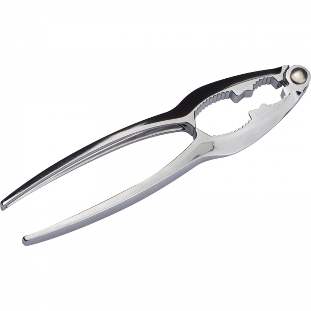 Metalowy dziadek do orzechów z podkładką wykonaną z bambusa.
