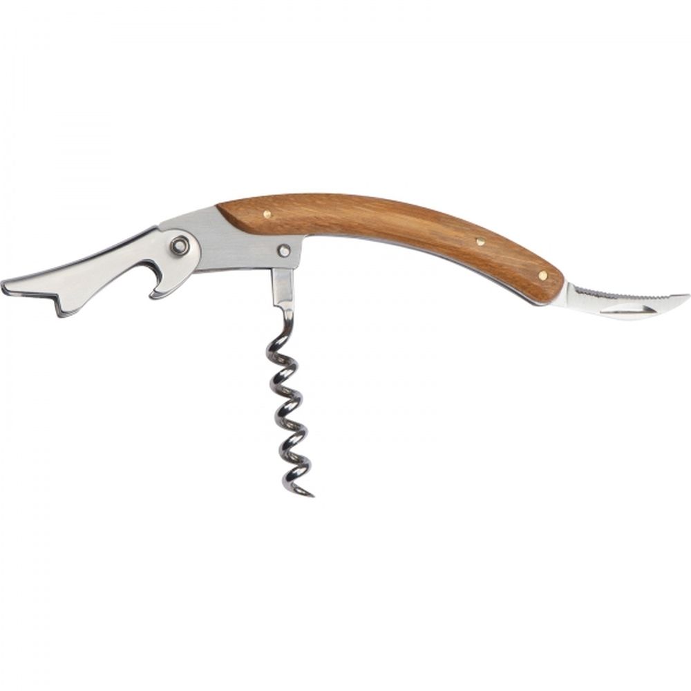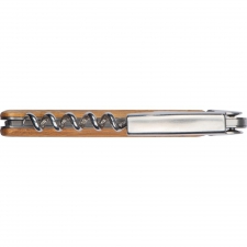 Nóż kelnerski z otwieraczem do butelek, nożykiem do folii i korkociągiem. Noż wykonany z metalu i drewna bambusowego.