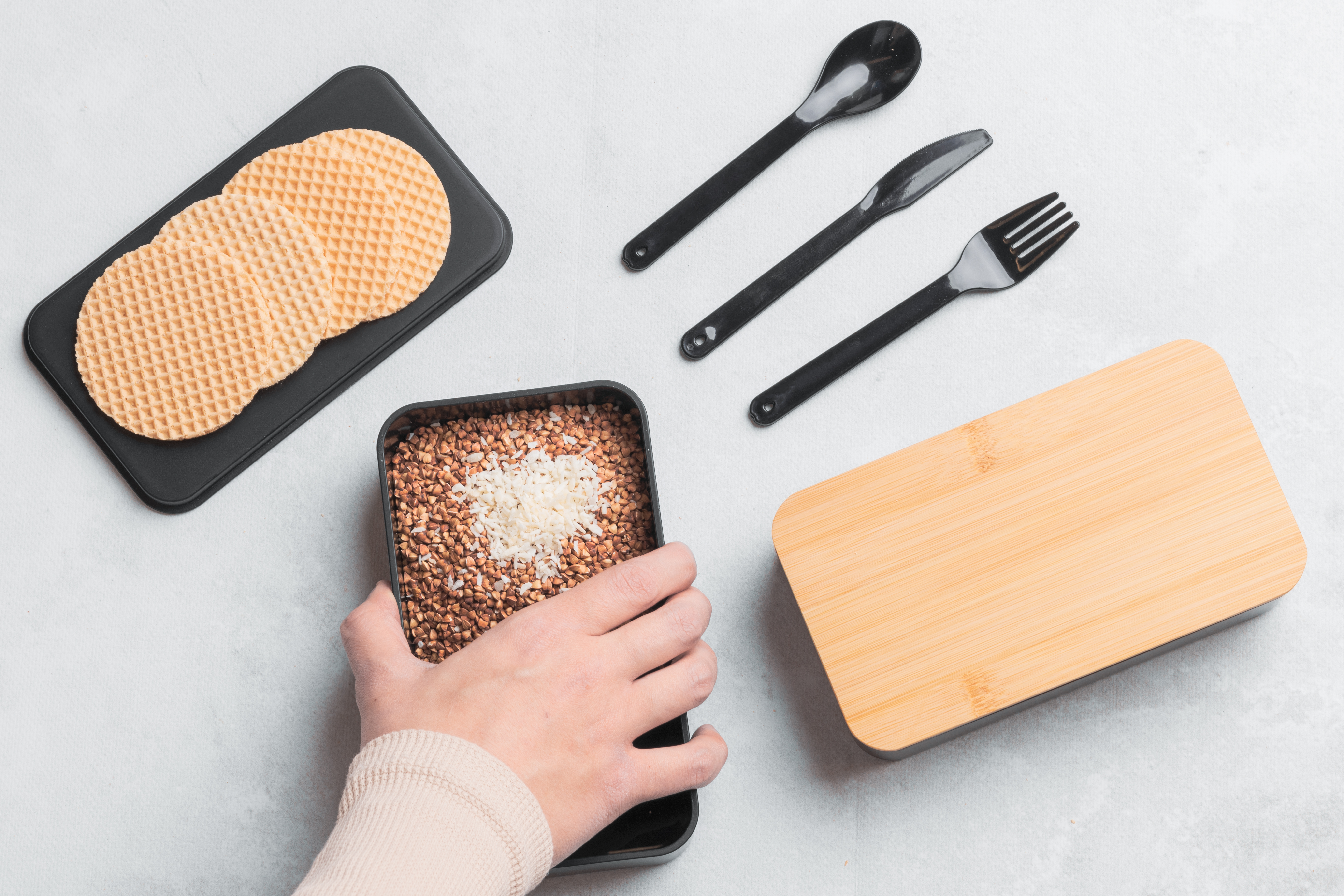 Dodatkowo, pudełko wyposażone jest w bambusową pokrywkę oraz przekładkę, umożliwiającą oddzielanie poszczególnych części posiłku w obrębie jednej przegrody. Bambusowa pokrywka może również pełnić rolę deseczki do krojenia lub outdoorowego talerzyka, co dodatkowo zwiększa funkcjonalność lunchboxa. W zestawie znajdziesz również praktyczne sztućce do jedzenia - nóż, widelec i łyżkę, które ułatwią Ci spożywanie posiłków w dowolnym miejscu.
