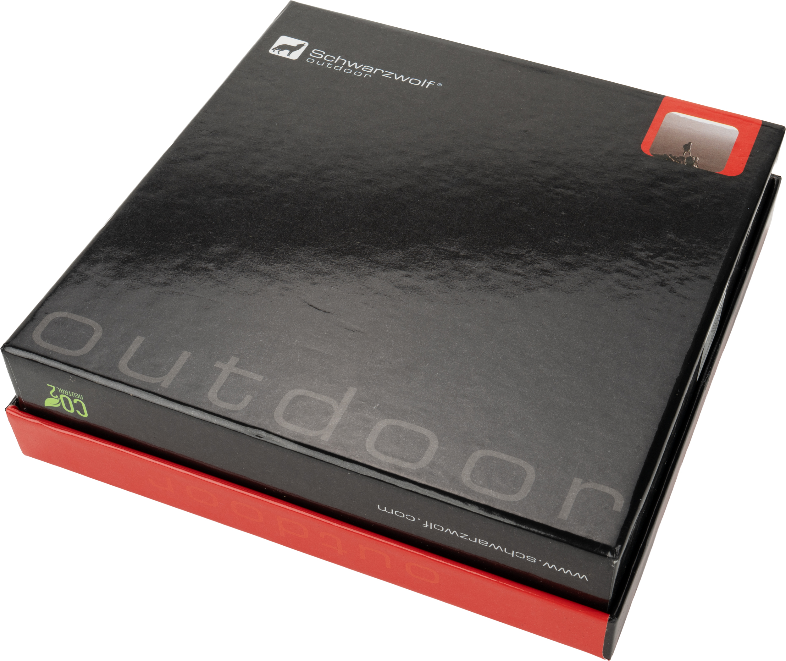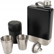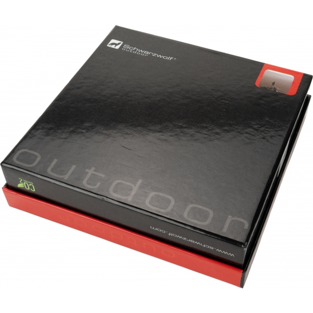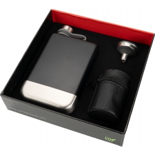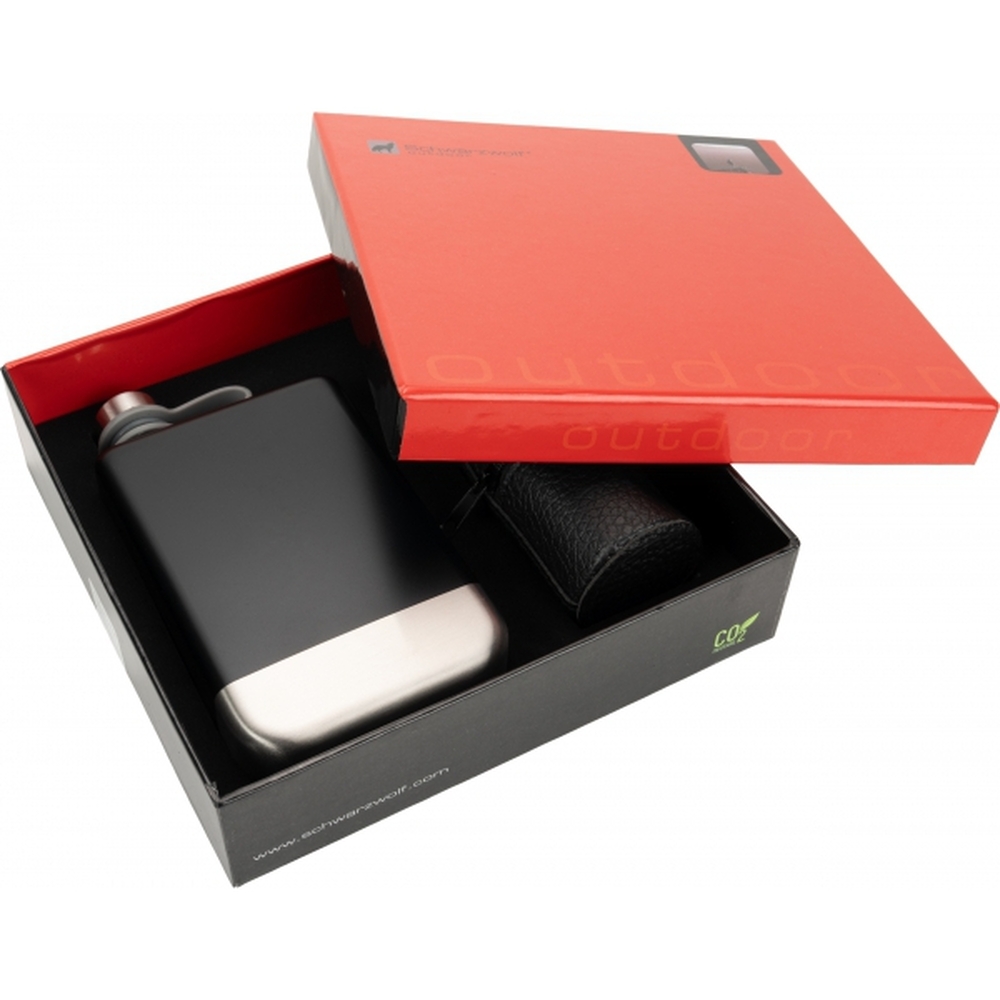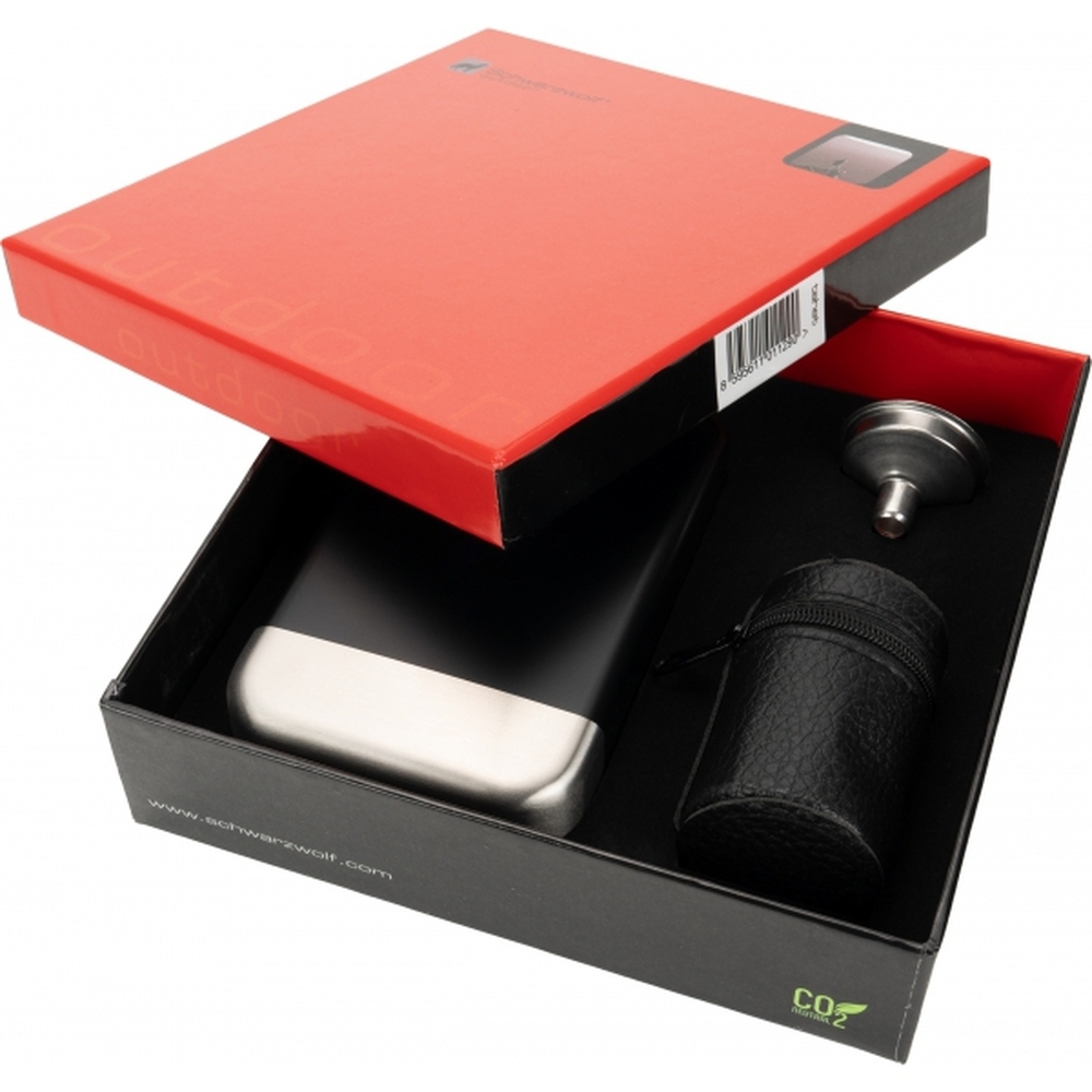 Zestaw Schwarzwolf hip flask set. Zawiera: piersiówkę w czarno-srebrnej kombinacji ze stali nierdzewnej, kieliszki 30 ml w czarnym woreczku i lejek. Na spodzie ścianki umieszczono logo Schwarzwolf. Rozmiar opakowania:18 x 18 x 4,5 cm