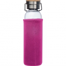 Szklana butelka o pojemności 600 ml, z pokrywką ze stali nierdzewnej i bambusowym zamknięciem. Butelkę przed uszkodzeniami chroni neopropanowe etui.