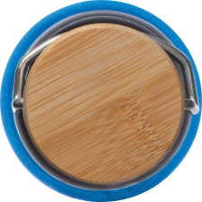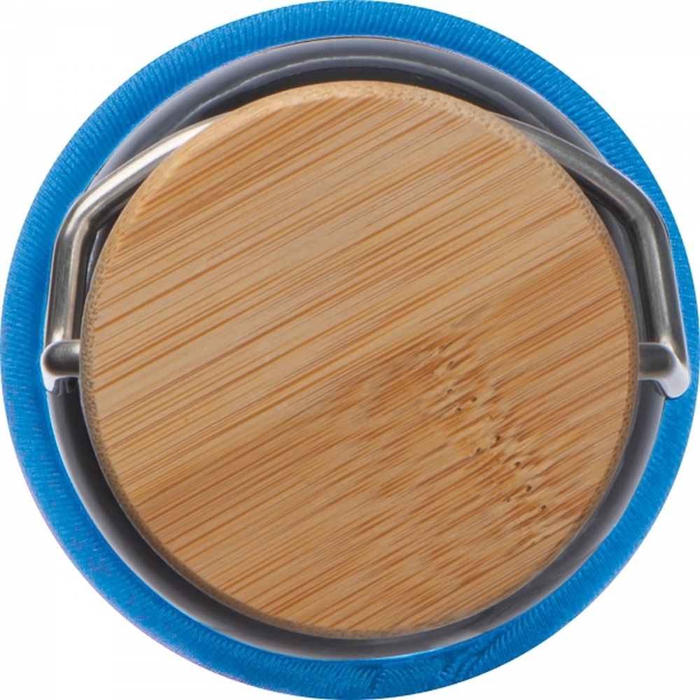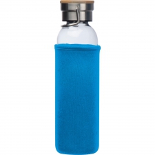 Szklana butelka o pojemności 600 ml, z pokrywką ze stali nierdzewnej i bambusowym zamknięciem. Butelkę przed uszkodzeniami chroni neopropanowe etui.