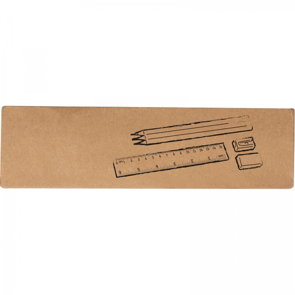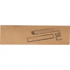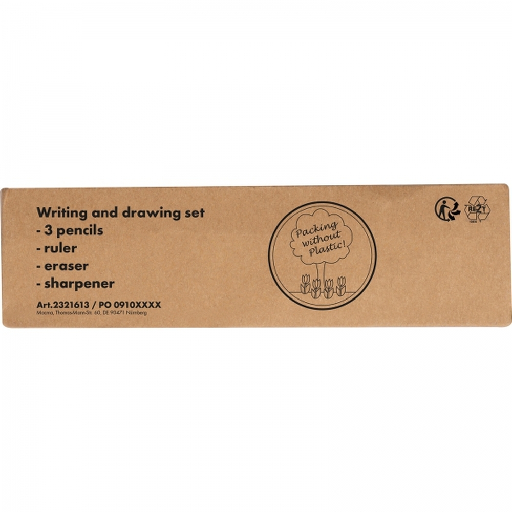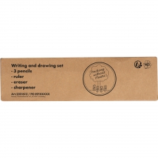 Drewniany zestaw piśmienniczy wyposażony w 3 ołówki o różnej twardości, gumkę do zmazywania, linijkę oraz temperówkę. Całość zapakowana w tekturowy kartonik z okienkiem.