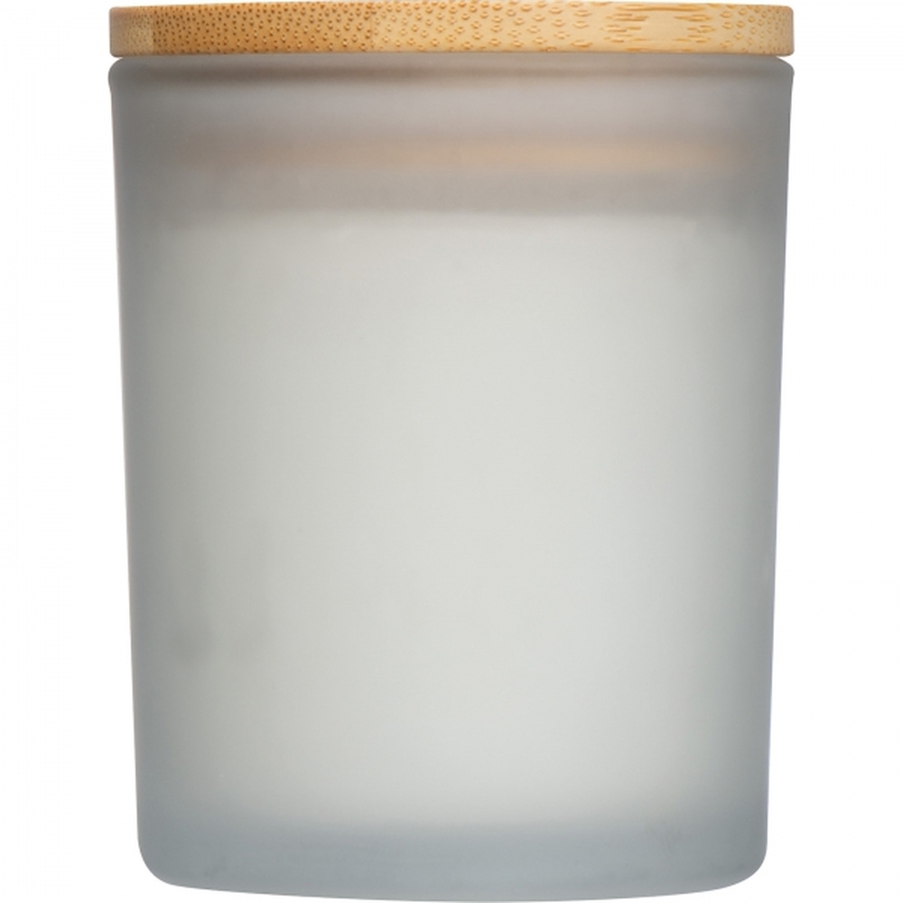 Świeczka dekoracyjna w szklanym pojemniku z bambusowym wieczkiem. Świeczka pakowana w kartonik.