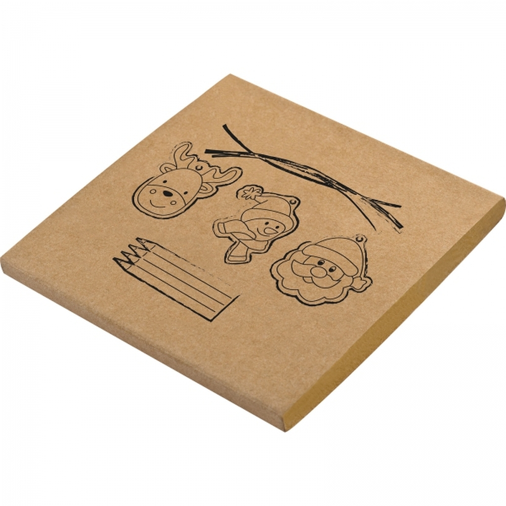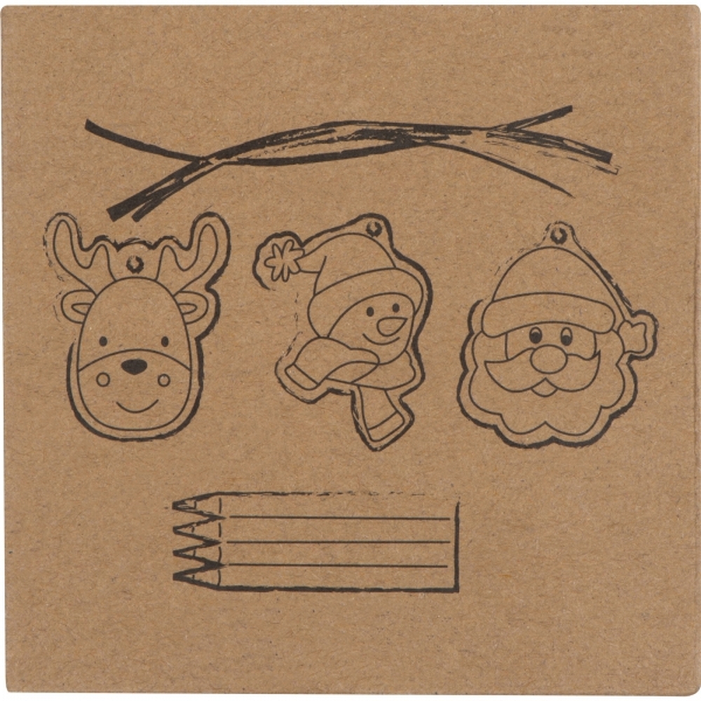 Zestaw zawieszek choinkowych wykonanych z drewna. W zestawie znajdują się 3 różne wzory - mikołaj, bałwanek i renifer oraz kredki, którymi można ozdobić zawieszki.