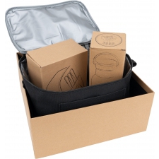 Zestaw upominkowy w ekologicznym opakowaniu, składający się z pudełka śniadaniowego (aluminium z zamykaną bambusową pokrywką), torby termicznej z juty oraz butelki do picia (stal nierdzewna o pojemności 500 ml).