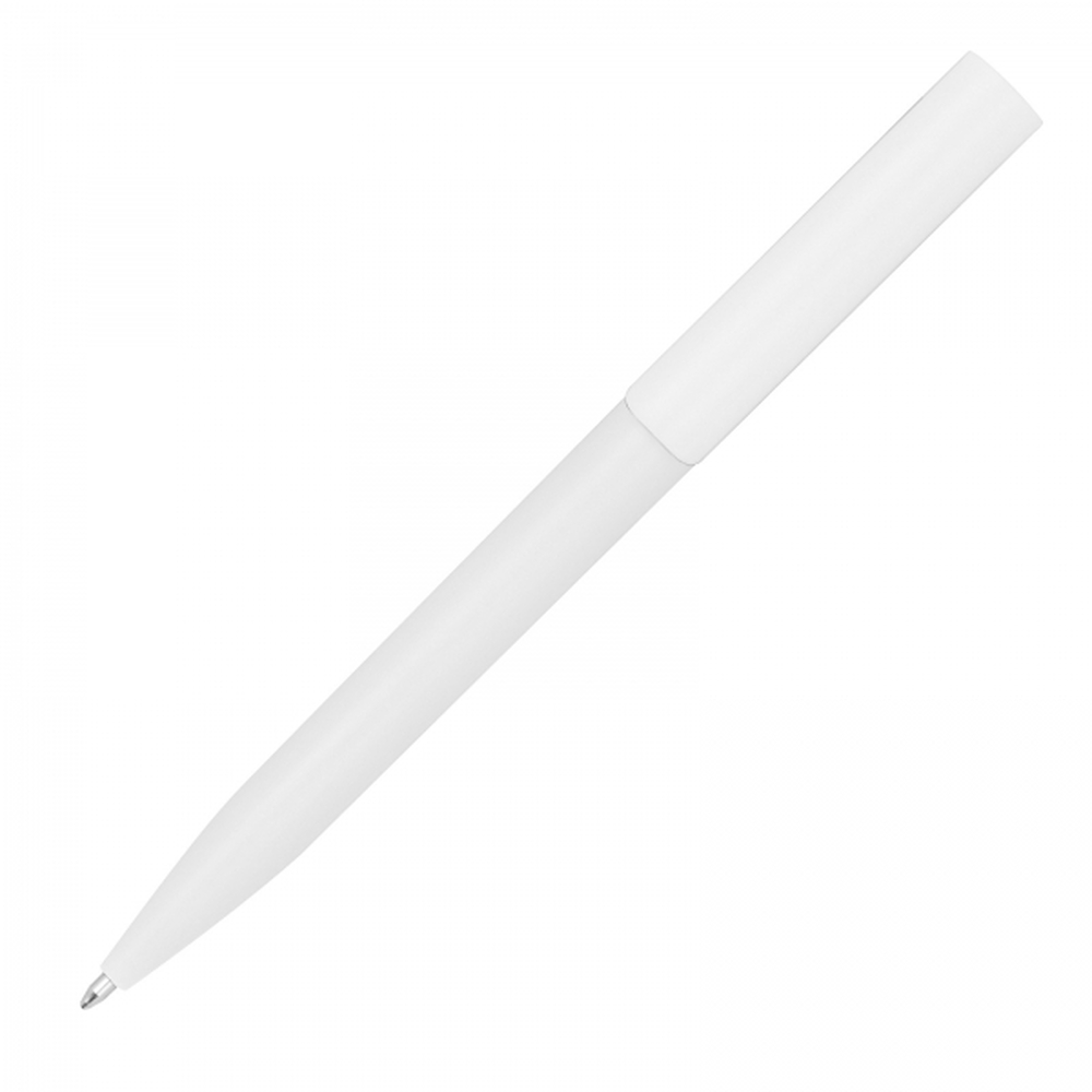 Plastikowy długopis z niebieskim wkładem i dużym białym klipem.