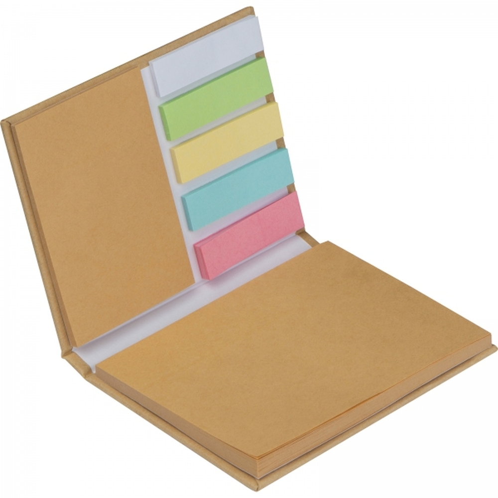 Karteczki do markowania. Bloczek zawiera 50 szt. dużych kartek do notowania z brązowego papieru, 25 szt. mniejszych karteczek samoprzylepnych oraz 24 kolorowych karteczek do markowania.