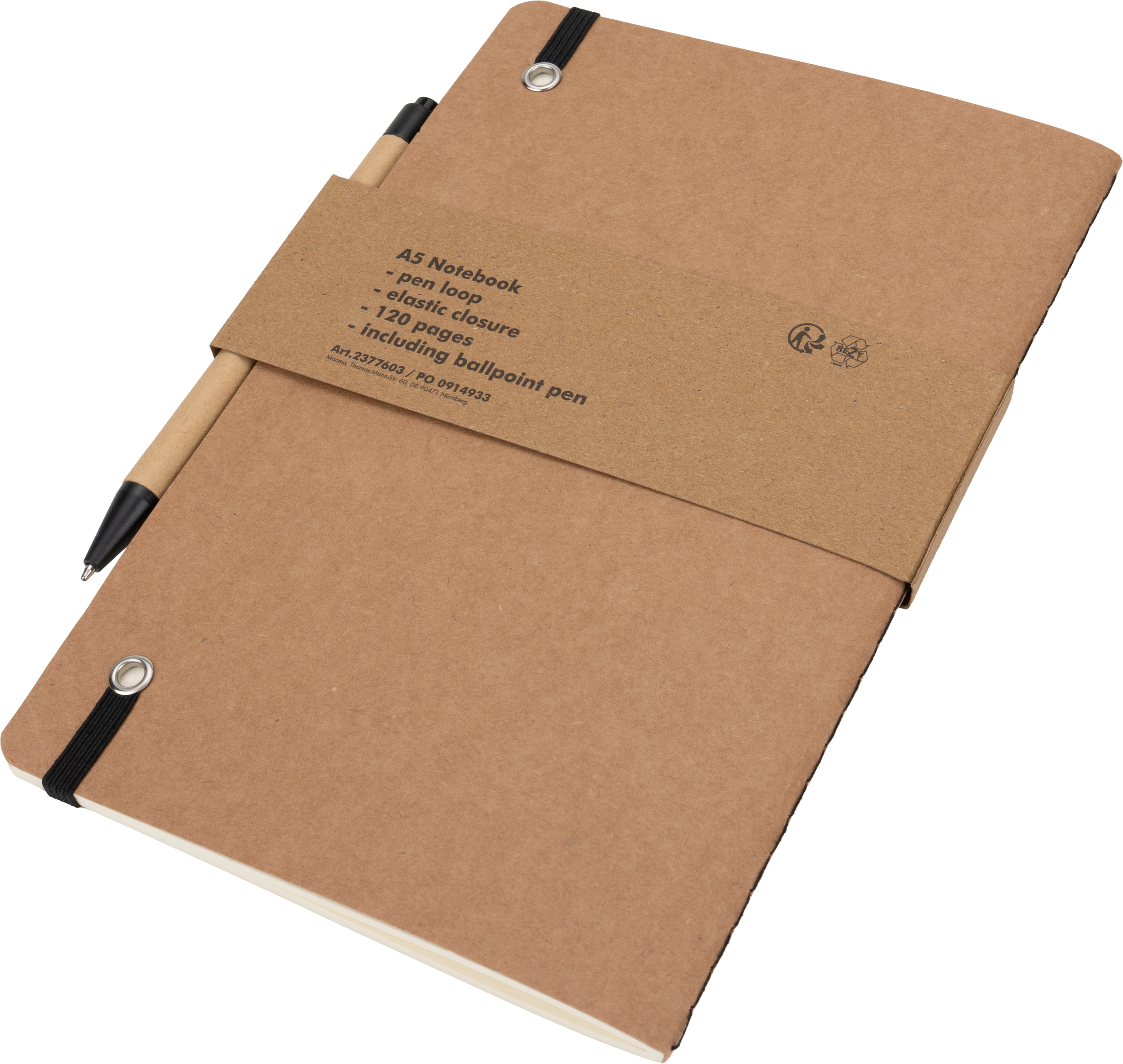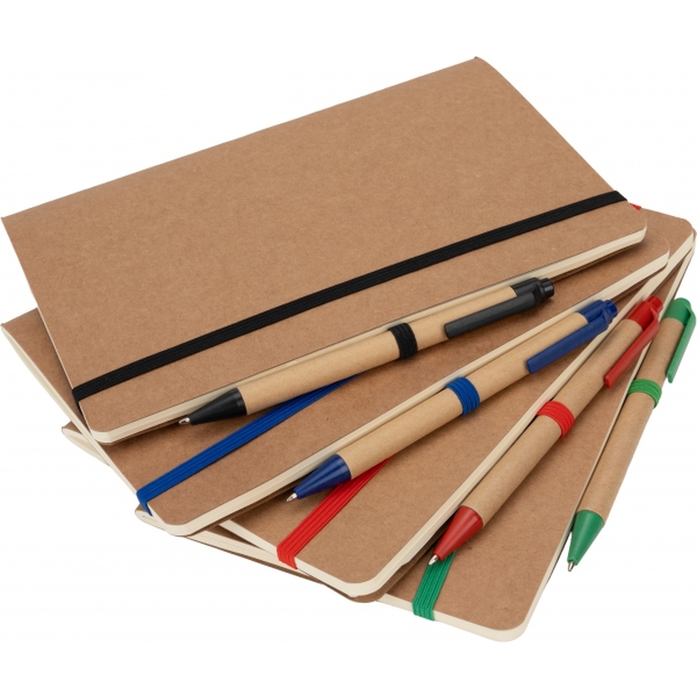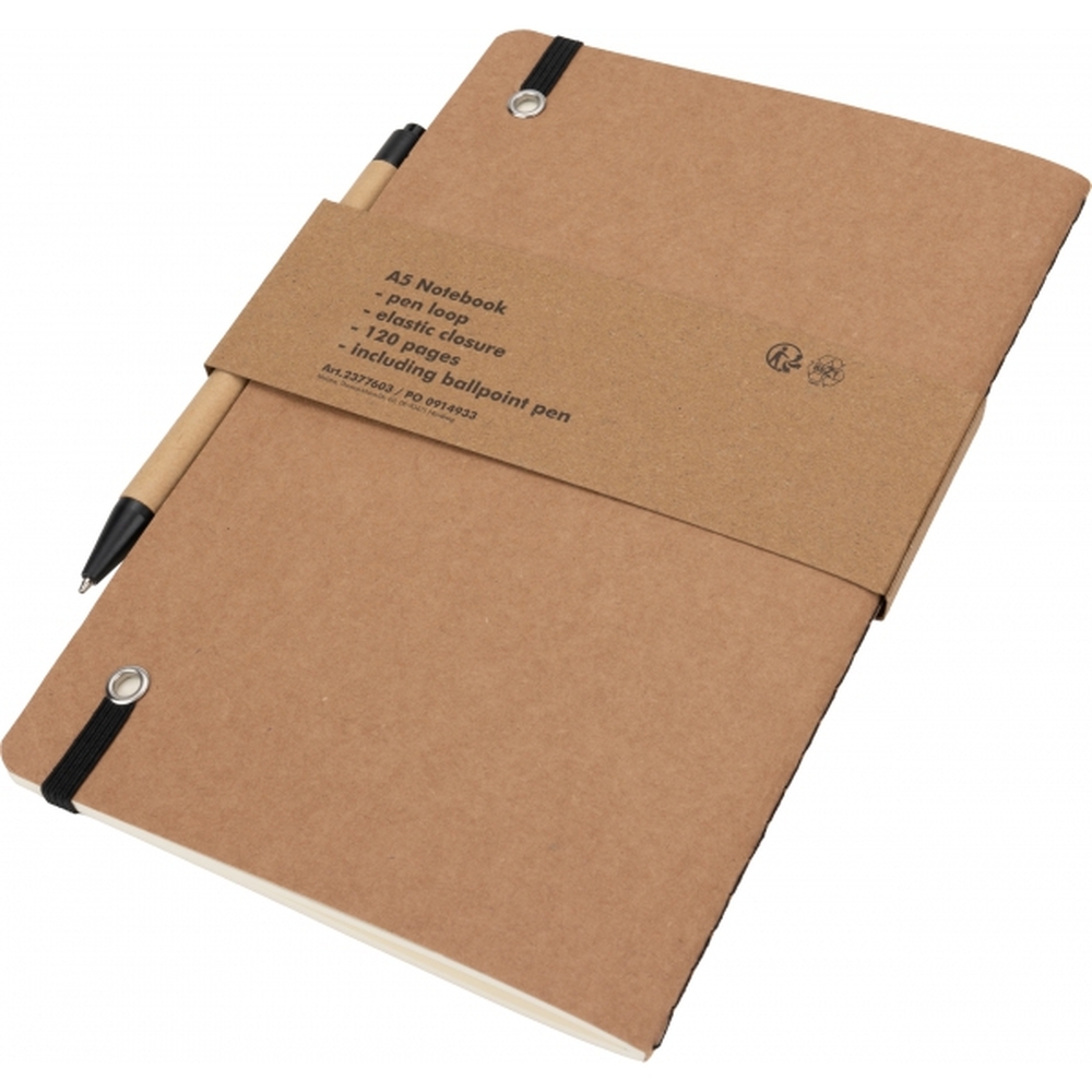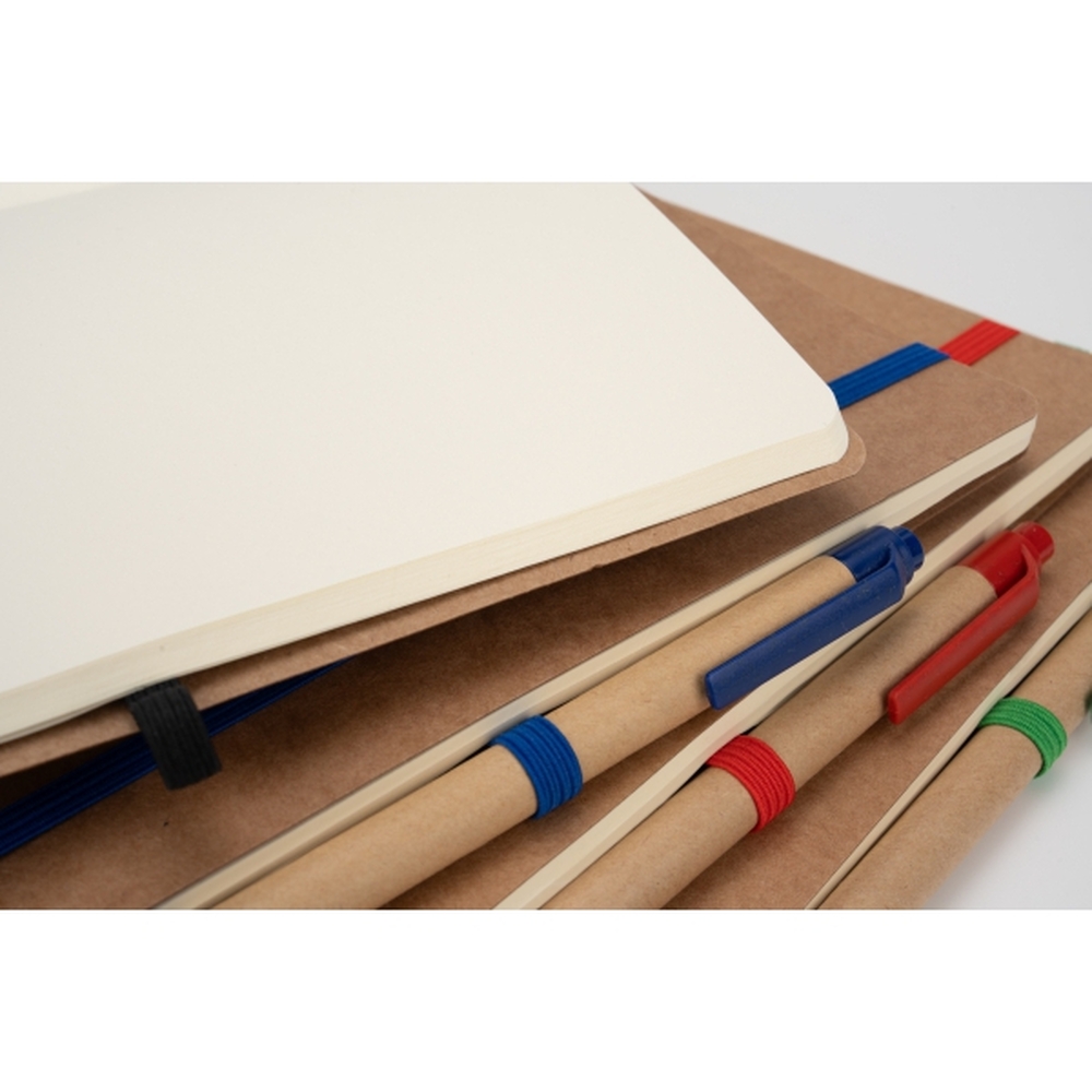 Notes o formacie A5, wykonany z papieru pochodzącego z recyklingu, posiada 120 czystych stron, zamknięcie na gumkę i długopis z niebieskim wkładem.