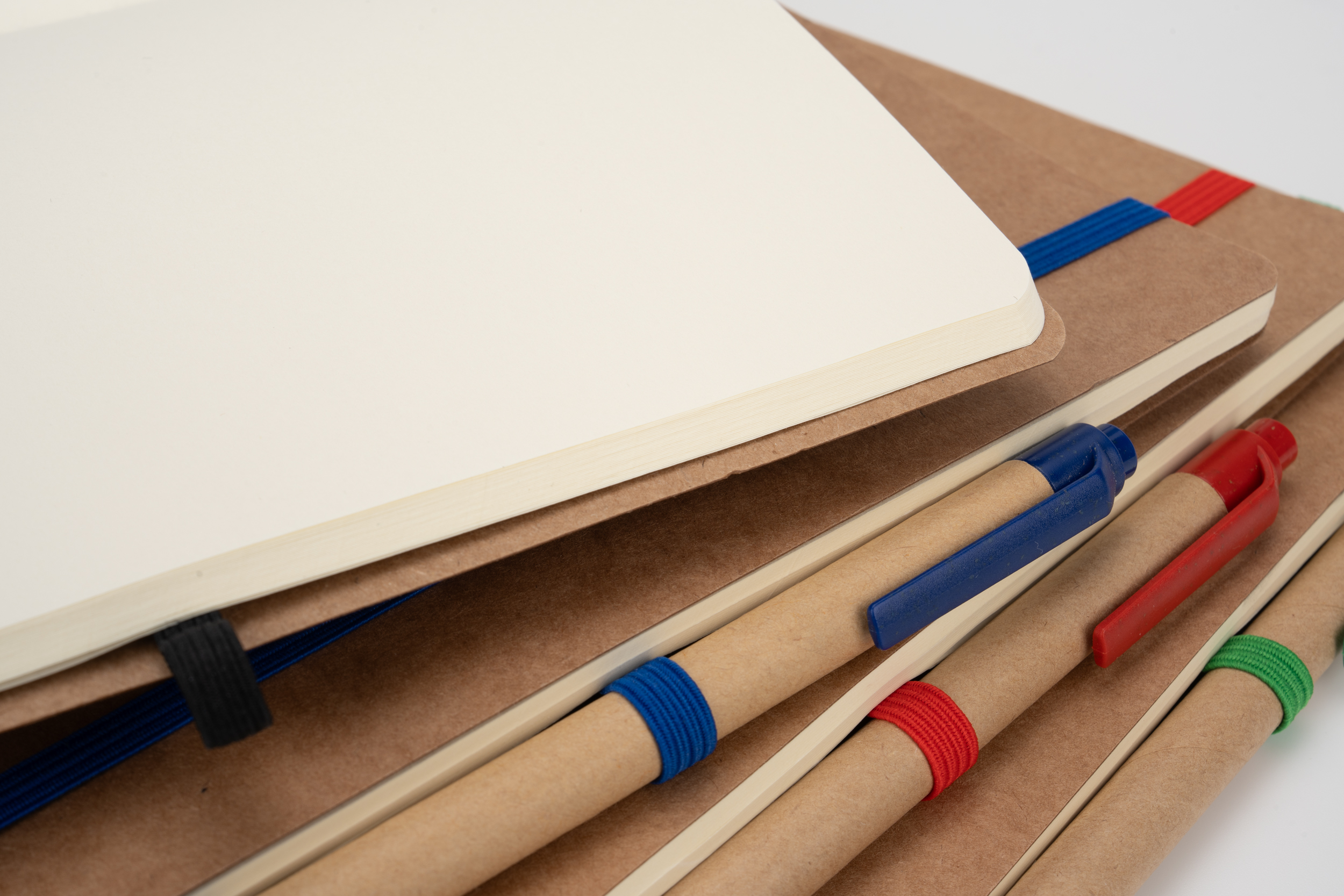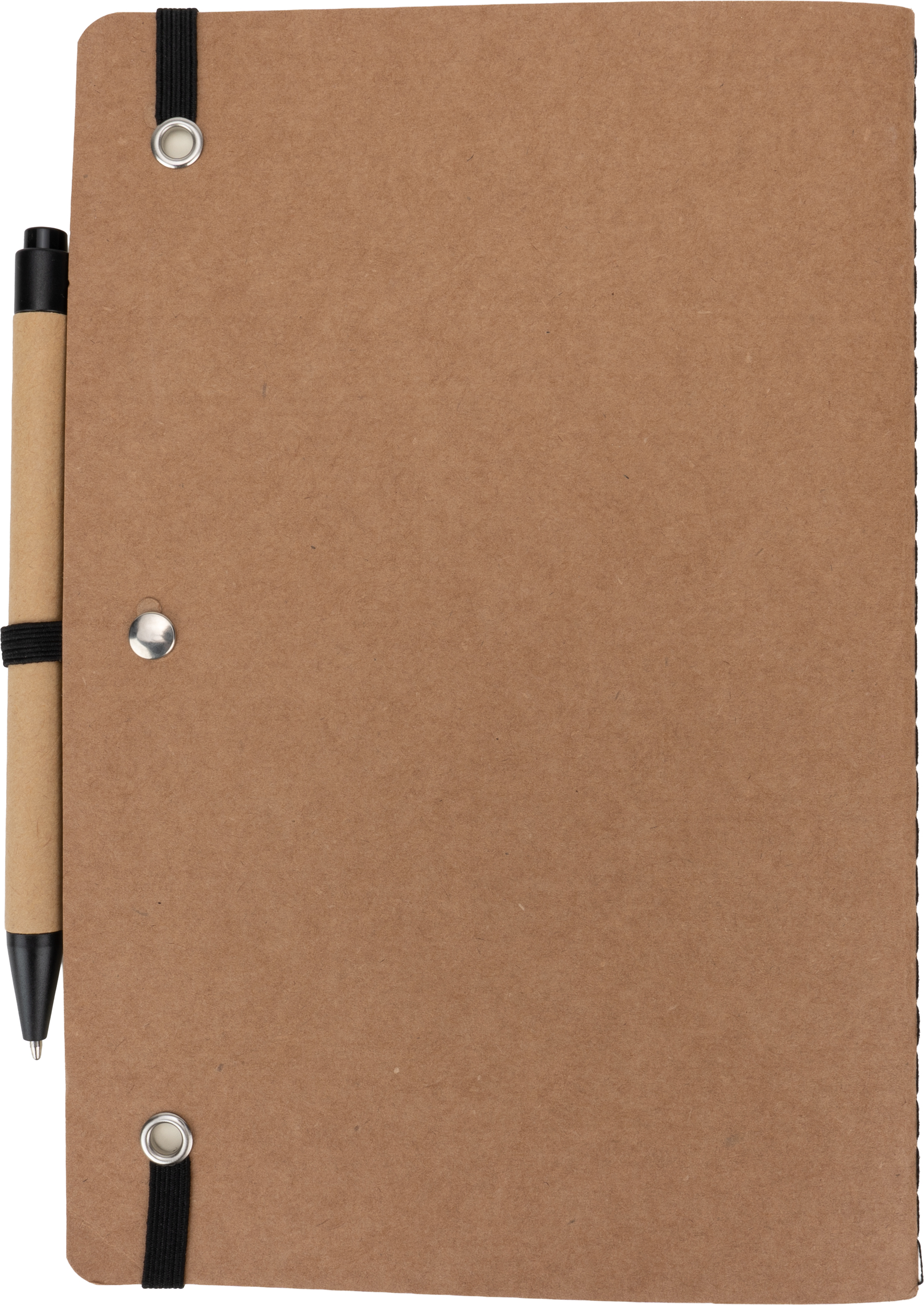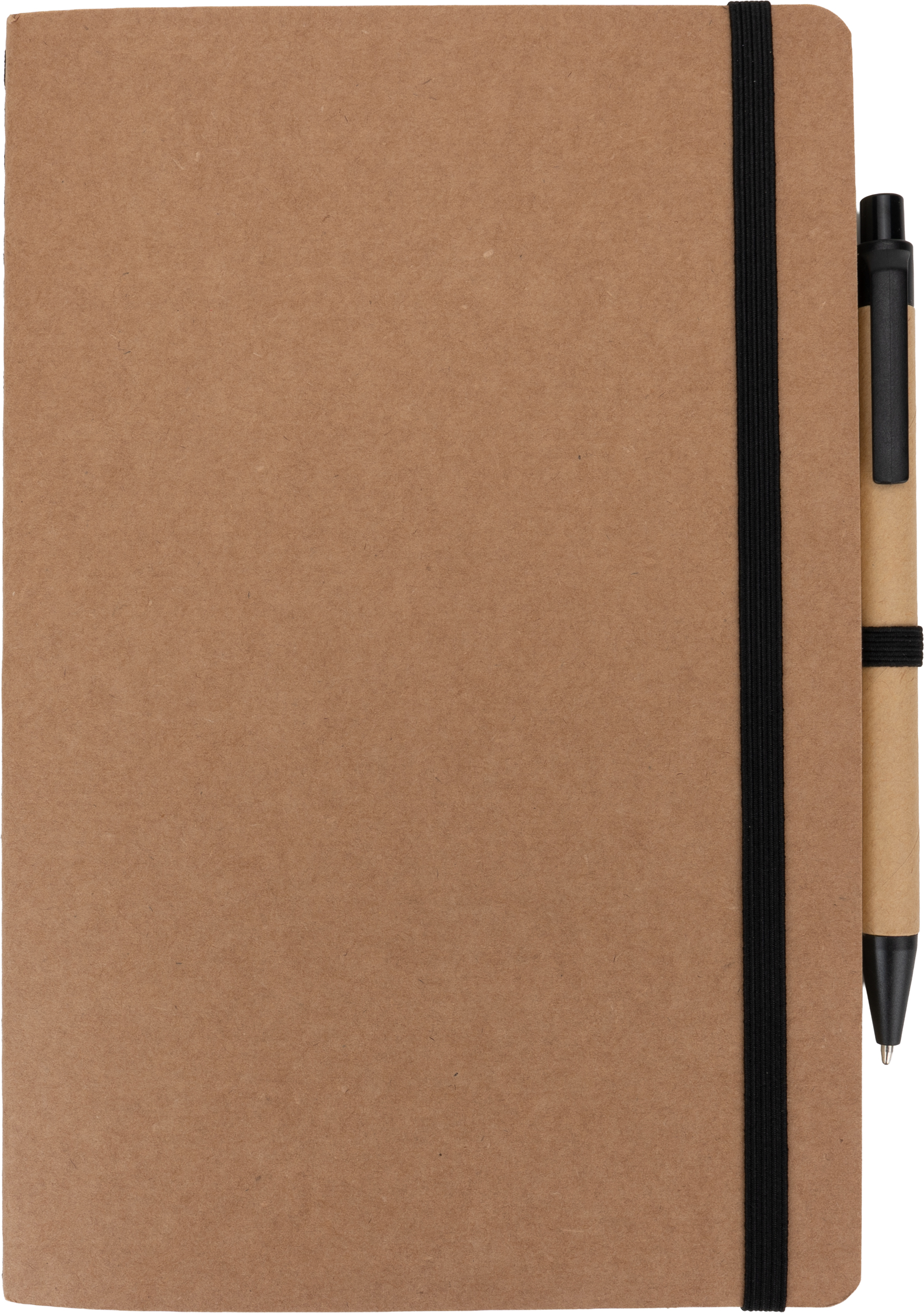 Notes o formacie A5, wykonany z papieru pochodzącego z recyklingu, posiada 120 czystych stron, zamknięcie na gumkę i długopis z niebieskim wkładem.