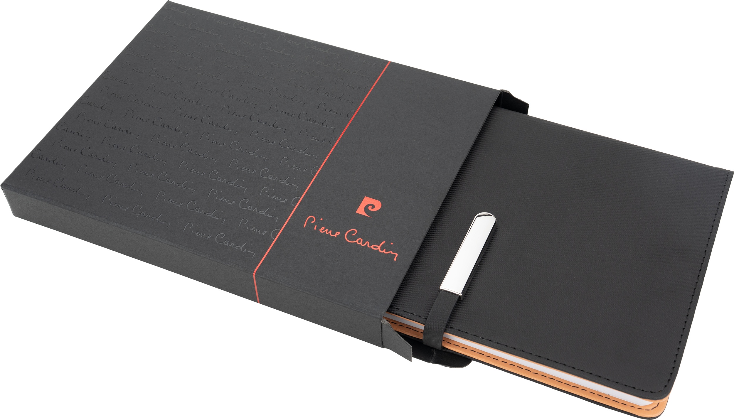 Luksusowy notatnik Pierre Cardin o formacie A5, w twardej okładce z czarnymi przeszyciami. Notes posiada magnetyczne zamknięcie, 192 strony w linie o gramaturze 70 g/m2. Pakowany w pudełko prezentowe z certyfikatem autentyczności.