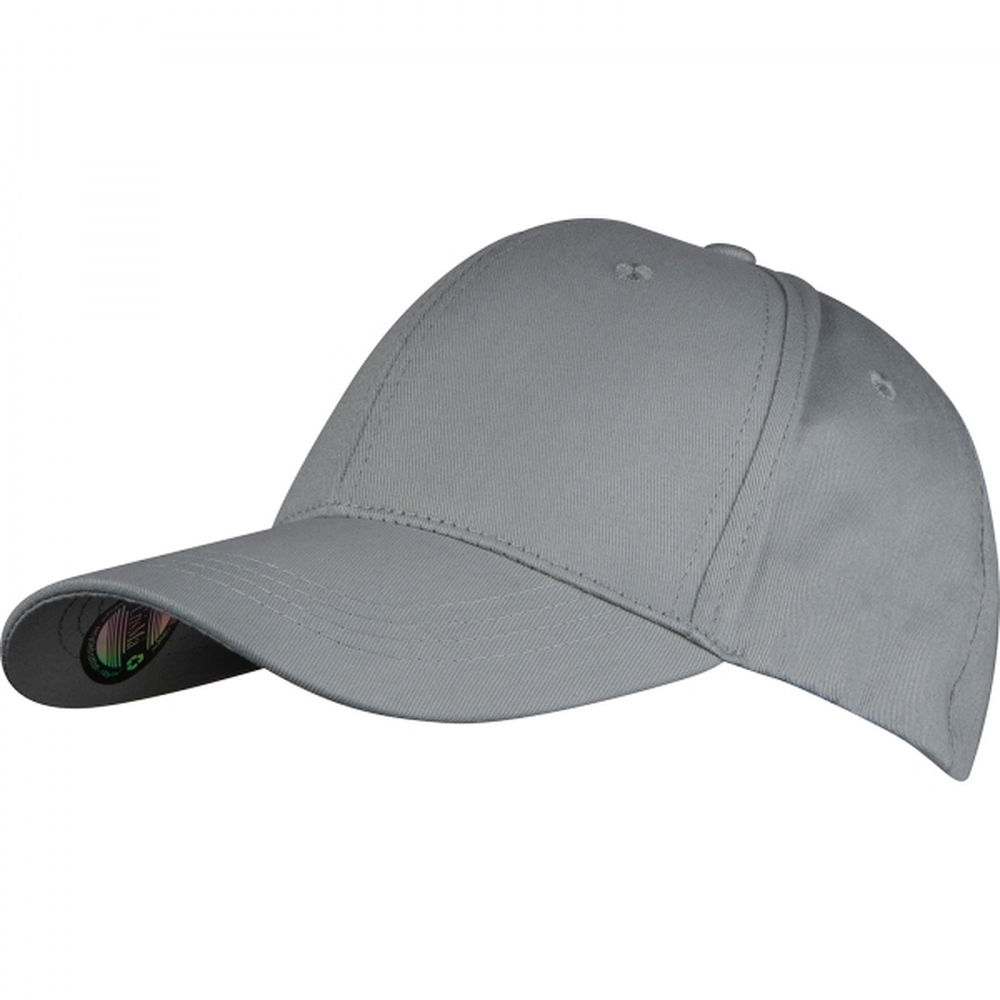 Czapka bejsbolówka z 6 panelami, wykonana z bawełny o gramaturze 190 g/m2 pochodzącej z recyklingu. Brak zapięcia, elastyczna taśma wewnątrz czapki.